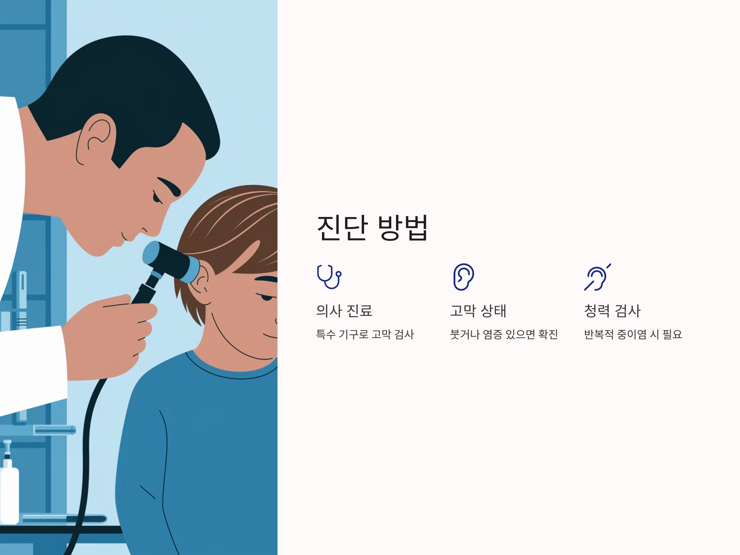 중이염을 의심하는 부모는 빠르게 의료 전문가와 상담하는 것이 중요합니다. 진단은 주로 다음과 같은 방법으로 이루어집니다: