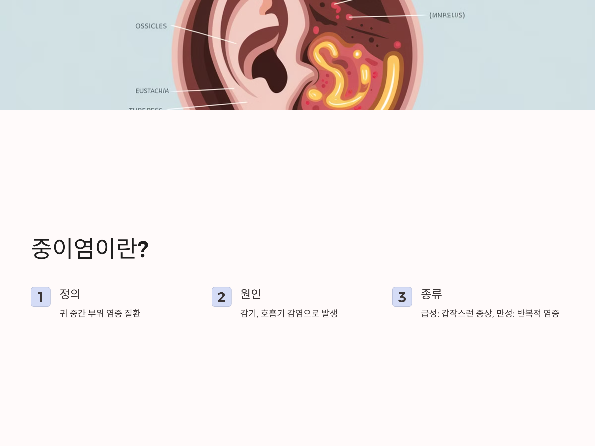 영유아 중이염은 자주 발생하는 질환으로, 아이의 귀에 불편함을 주지만 적절히 대처하면 빠르게 회복할 수 있습니다. 부모는 아이의 증상을 주의 깊게 살피고, 중이염이 의심되면 즉시 의사와 상담하여 정확한 진단을 받고 치료를 시작하는 것이 중요합니다. 또한 예방을 위해 손 씻기와 위생을 철저히 하고, 주기적인 예방접종을 받도록 도와야 합니다. 아이의 건강을 지키기 위해서는 꾸준한 관리와 관심이 필요합니다.