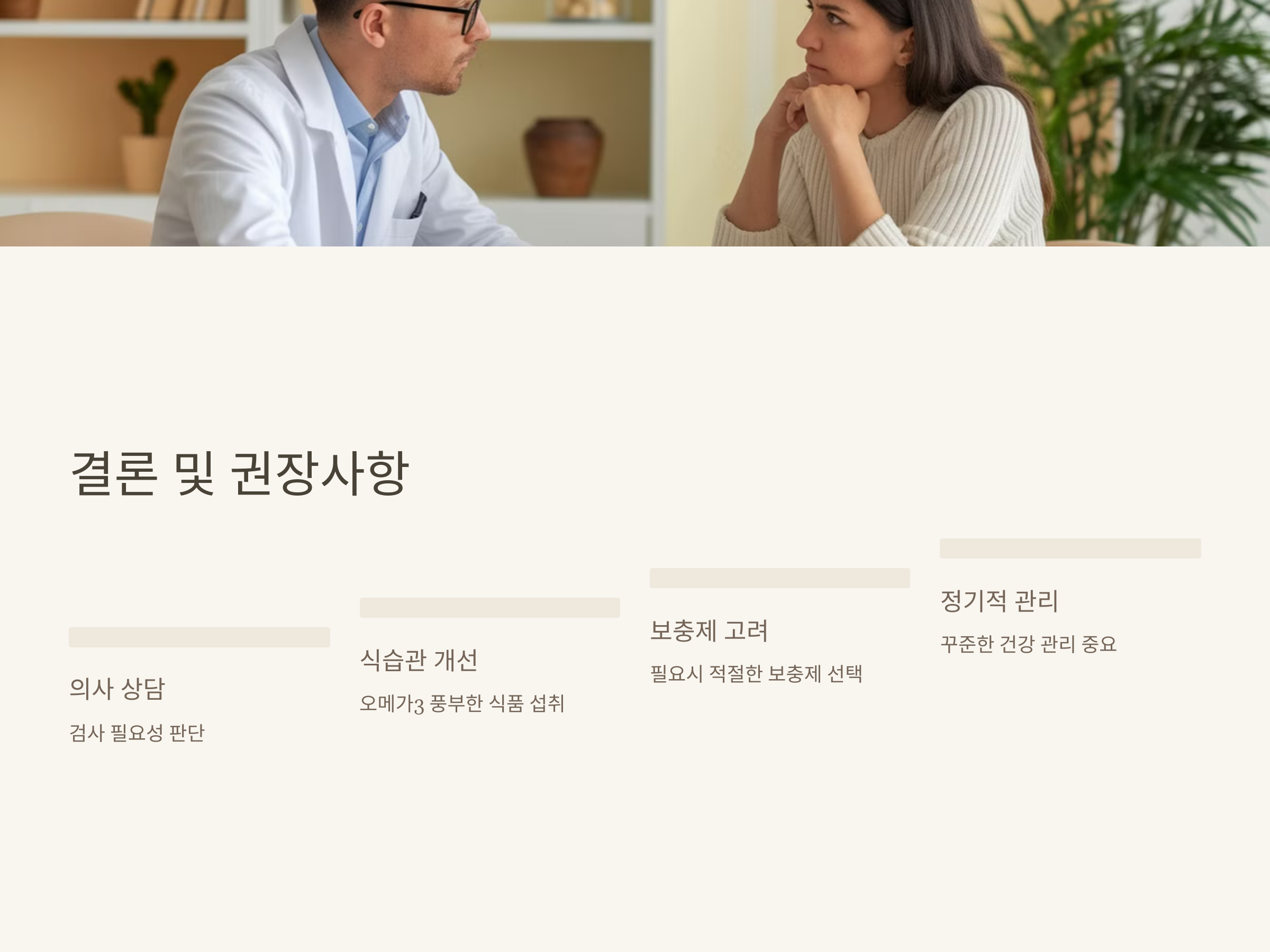 검사를 받기 전에 정확한 정보와 의사의 상담을 통해 오메가3 결핍 여부를 확인하고, 필요한 경우 검사를 진행하는 것이 좋습니다. 또한, 식습관 개선과 보충제를 통한 오메가3 섭취를 고려하면서 건강을 지켜 나가는 것이 중요합니다.