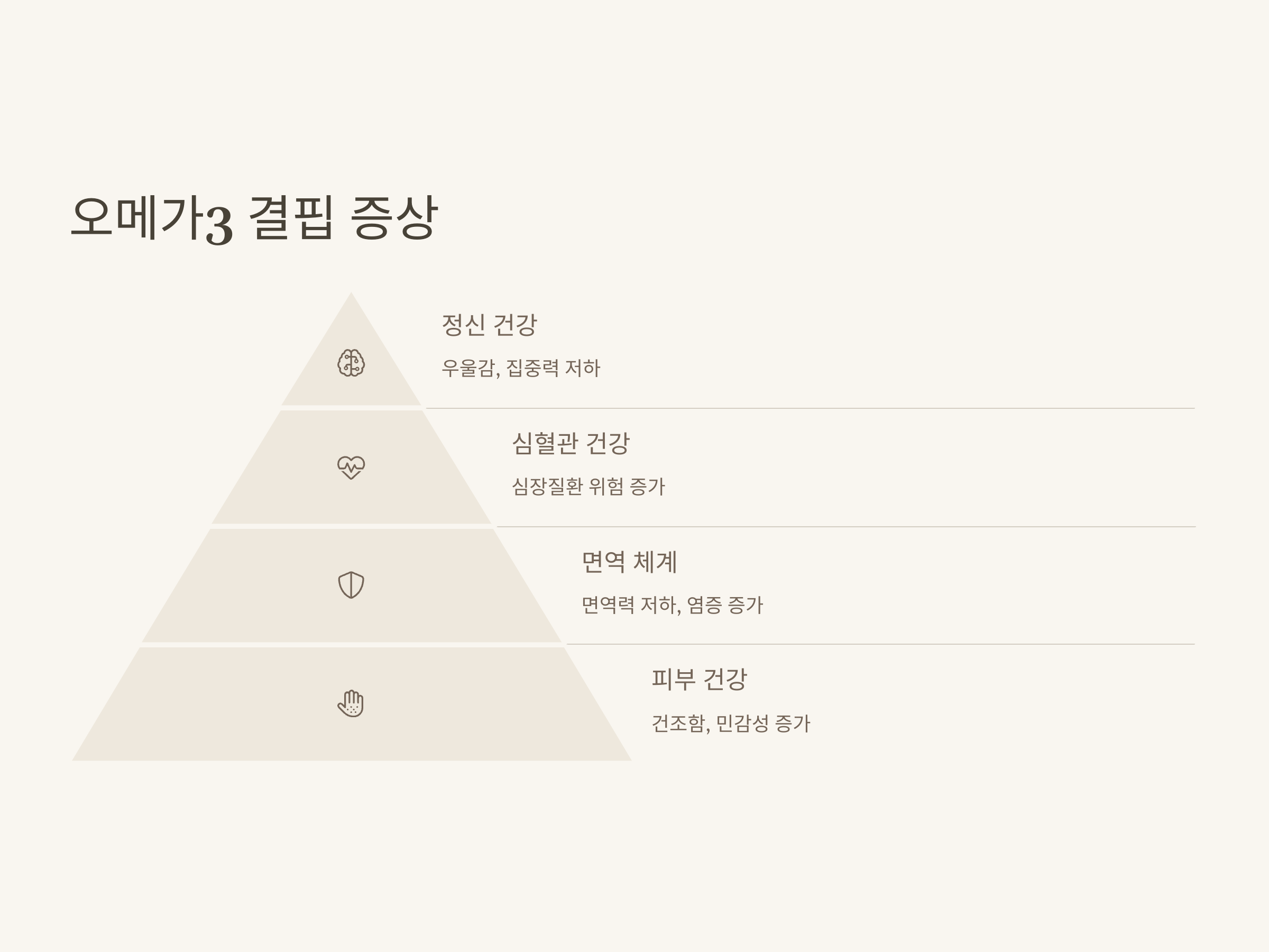 오메가3 결핍은 여러 증상을 유발할 수 있습니다. 주요 증상으로는 피로감, 우울감, 면역력 저하, 피부 건조 등이 있습니다. 이 외에도 심혈관 질환이나 염증성 질환이 발생할 수 있기 때문에 오메가3 섭취가 중요합니다.