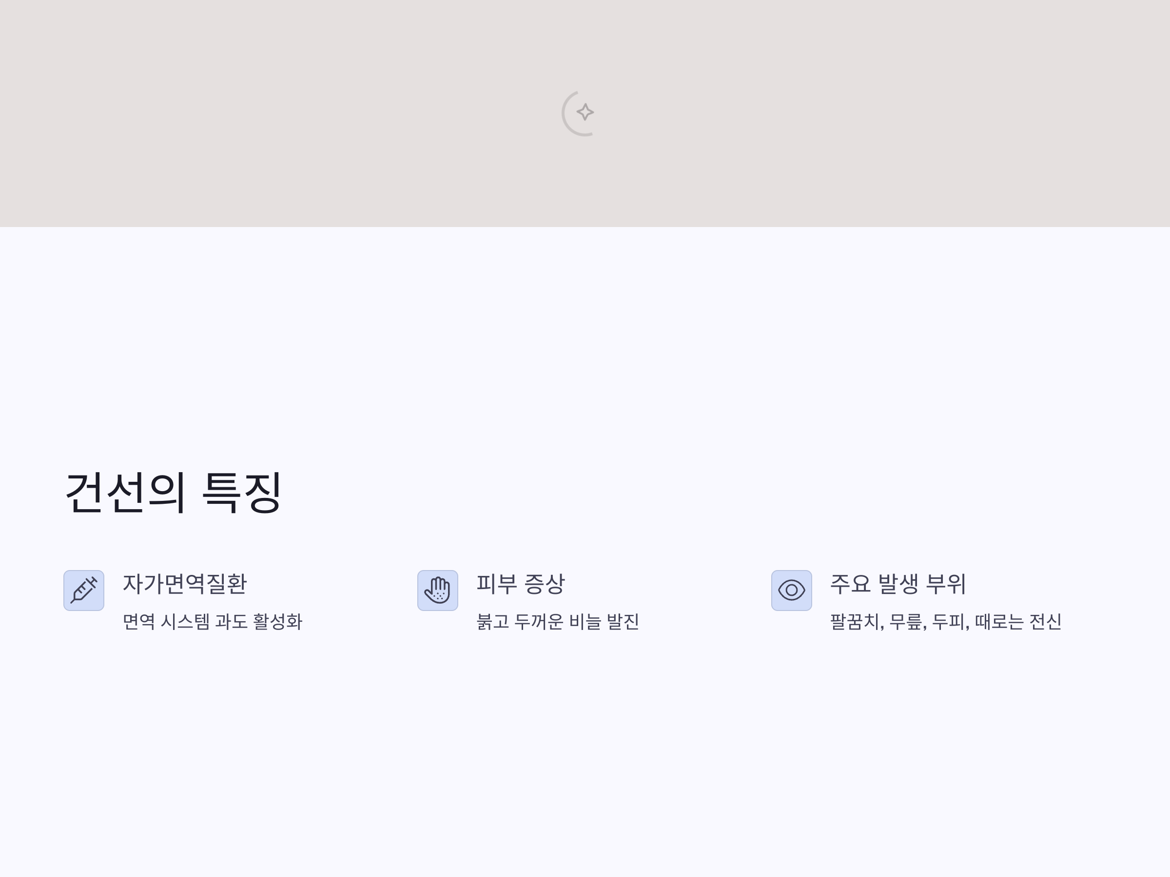 건선은 자가면역질환으로, 면역 시스템이 과도하게 활성화되어 피부 세포의 빠른 증식과 각질화를 일으키는 질환입니다. 건선의 주요 증상은 붉고, 두꺼운 비늘이 있는 피부 발진입니다. 이 발진은 주로 팔꿈치, 무릎, 두피에 나타나며, 때로는 전신으로 퍼질 수도 있습니다. 또한, 건선은 가려움증과 함께 피부의 건조함을 유발하며, 이로 인해 피부가 벗겨지는 현상이 발생할 수 있습니다. 건선은 면역체계에 의한 염증 반응이 원인이라서, 가려움증이 심해지고 피부가 건조하게 변하는 것은 자연스러운 결과입니다.