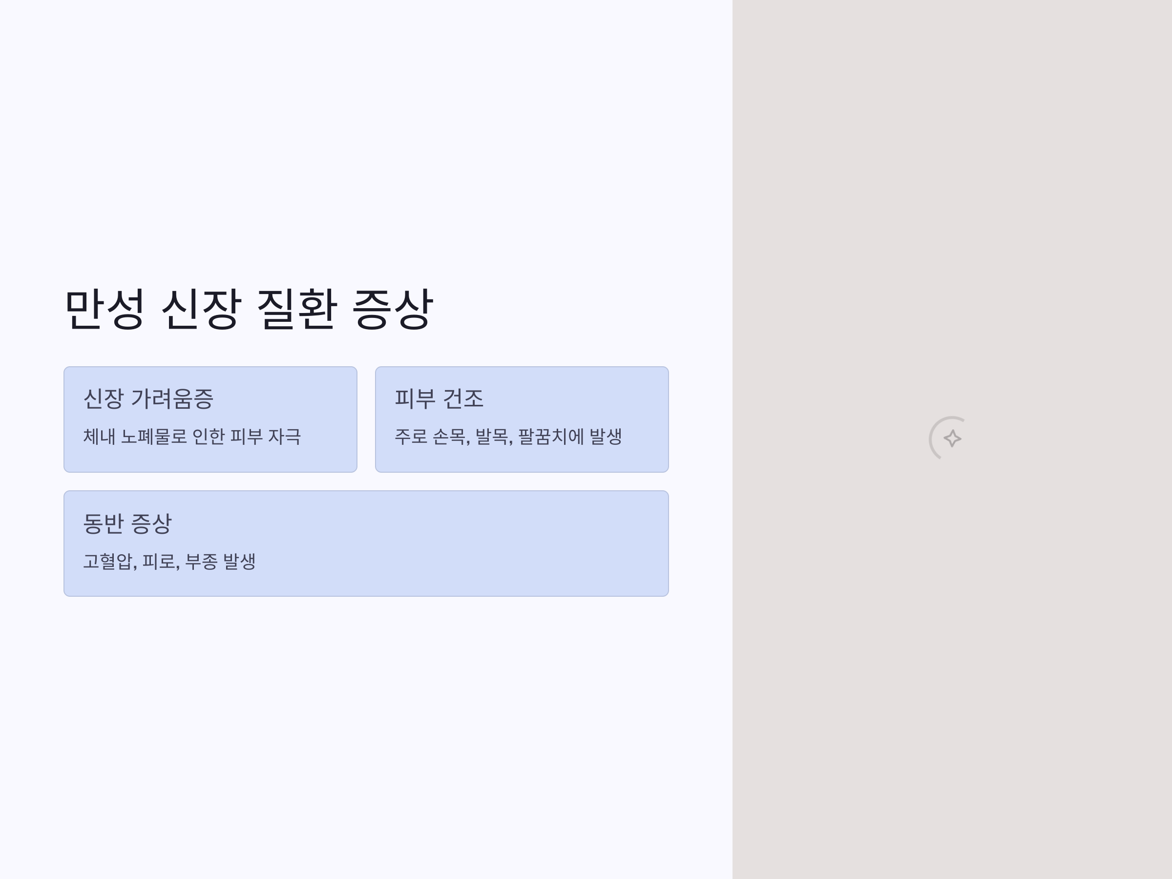 만성 신장 질환에서 발생하는 가려움증은 '신장 가려움증'이라고도 불리며, 특히 피부가 건조하고, 긁은 자리에 상처가 남을 수 있습니다. 이는 체내 노폐물이 제대로 배출되지 않아 피부에 염증이나 자극을 일으키기 때문입니다. 신장 질환으로 인한 피부 건조와 가려움증은 주로 손목, 발목, 팔꿈치 등 신체 부위에서 많이 나타납니다. 또한, 만성 신장 질환은 고혈압, 피로, 부종(부기) 등의 다른 증상을 동반할 수 있습니다.
