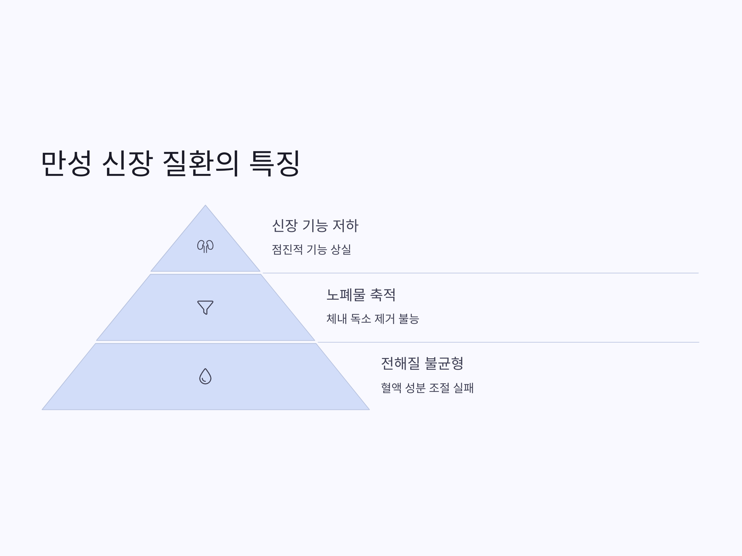 만성 신장 질환은 신장이 점진적으로 기능을 잃어가는 상태를 말합니다. 신장은 체내 노폐물과 여분의 물을 걸러내고, 혈압을 조절하며, 전해질 균형을 유지하는 중요한 역할을 합니다. 만성 신장 질환이 진행되면 이 모든 기능이 손상되어 여러 증상이 나타납니다. 온몸의 가려움증과 건조함도 만성 신장 질환의 주요 증상 중 하나입니다. 이는 신장이 제 역할을 하지 못하면서 체내에 쌓인 노폐물이나 물질들이 피부에 영향을 미치기 때문입니다.