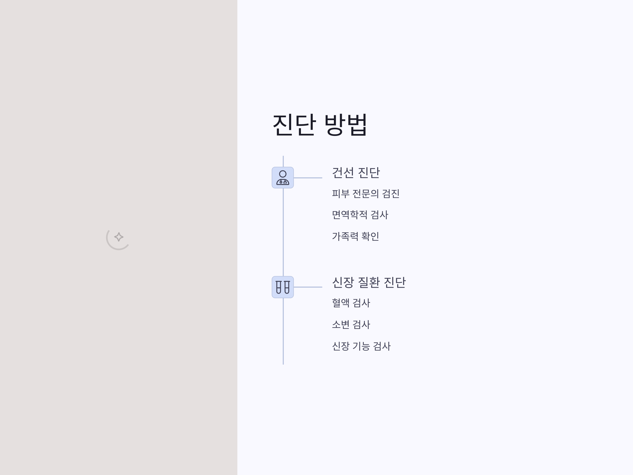 건선과 만성 신장 질환을 구분하는 가장 큰 방법은 증상의 발생 원인과 관련된 진단을 받는 것입니다. 건선은 피부 전문의나 면역학적 검사로 진단할 수 있으며, 피부에 나타나는 발진과 비늘 형태가 특징적인 징후입니다. 또한, 건선은 가족력이나 자가면역 질환과 연관이 있을 수 있습니다.