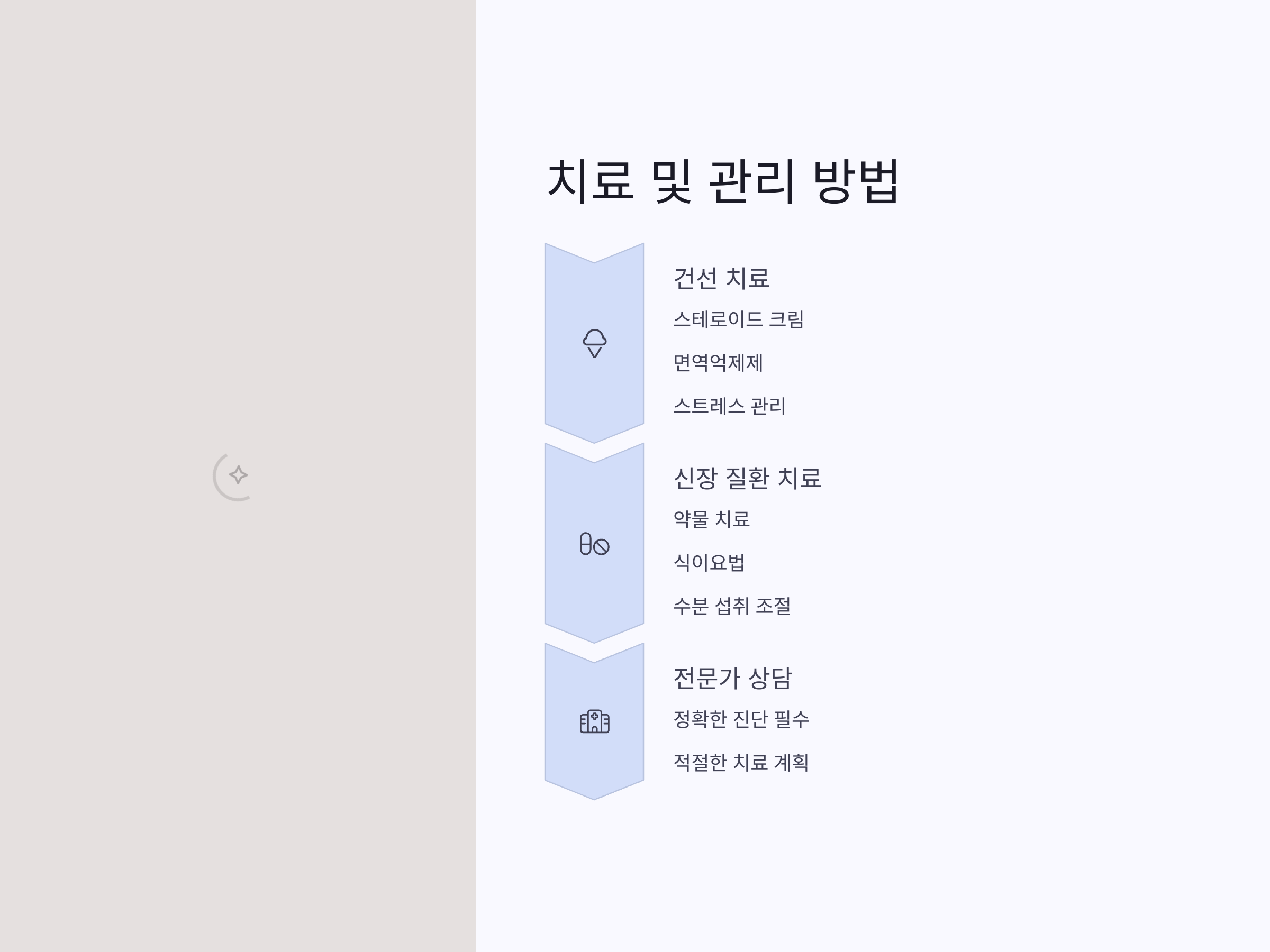 만성 신장 질환은 신장의 기능을 보호하고, 증상을 완화하는 치료가 필요합니다. 치료 방법으로는 약물 치료가 주로 사용되며, 식이요법과 수분 섭취 조절도 중요합니다. 만성 신장 질환이 진행되면 투석이나 신장 이식이 필요한 경우도 있을 수 있으므로, 빠른 진단과 치료가 중요합니다.