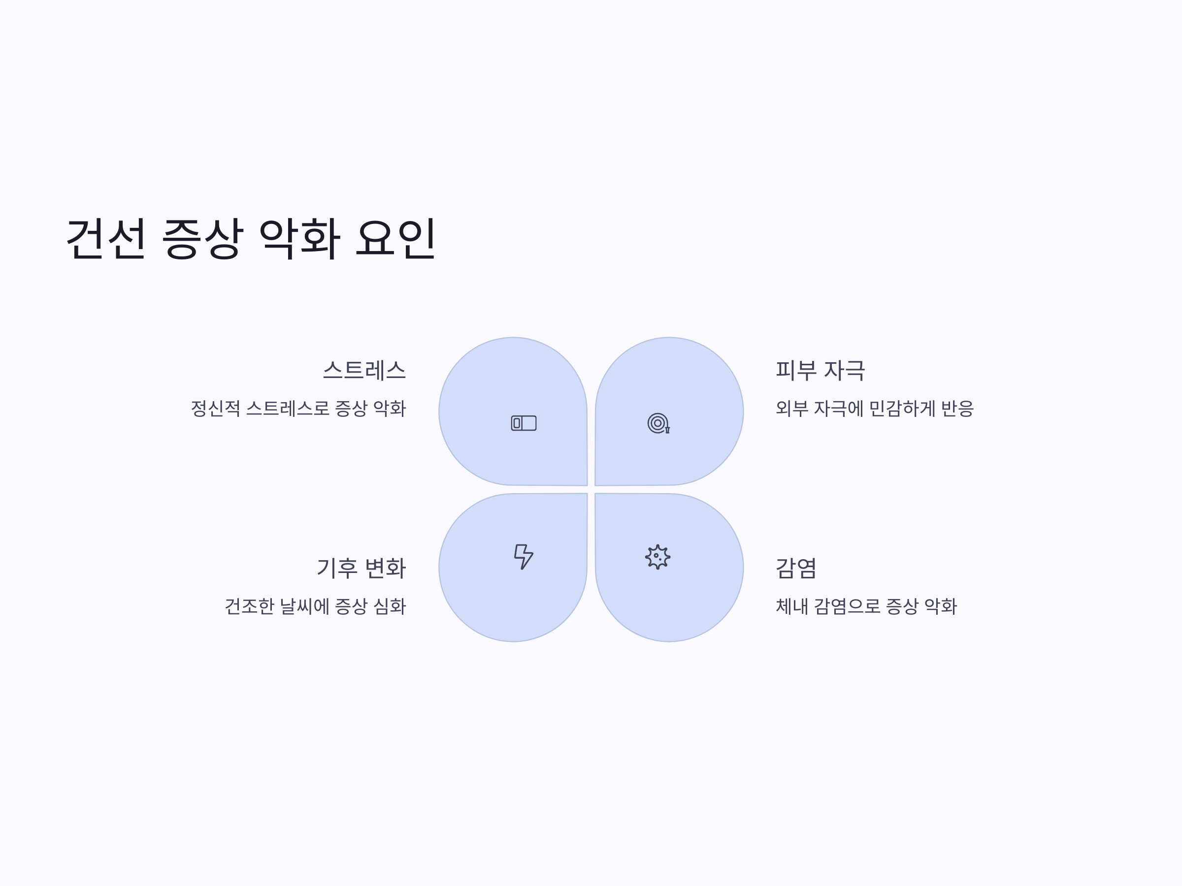 건선 환자는 종종 피부가 가렵고, 일부 사람들은 긁음으로써 피부에 상처를 입을 수 있습니다. 피부가 두꺼워지거나 균일하게 비늘이 생기면서 건조한 증상이 두드러지게 나타나게 됩니다. 또한 건선은 스트레스, 피부 자극, 감염, 기후 변화 등에 따라 악화될 수 있습니다. 건선의 증상은 전반적으로 피부의 형태와 색상에 영향을 미치며, 치료 없이는 계속해서 악화될 가능성이 있습니다.