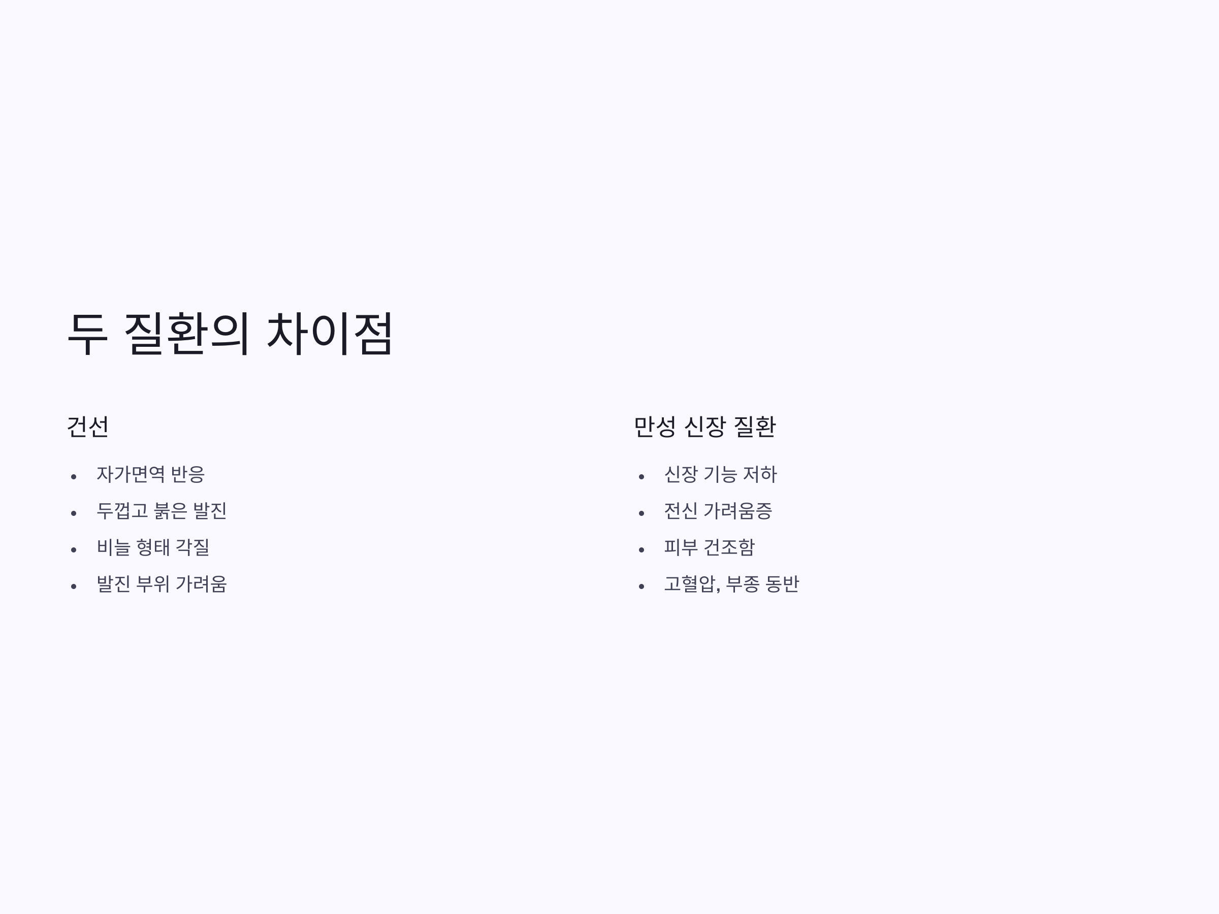 건선과 만성 신장 질환은 피부에 영향을 미친다는 공통점이 있지만, 두 질환은 원인과 증상에서 큰 차이를 보입니다. 건선은 자가면역질환으로, 면역 시스템이 피부 세포를 공격해 염증을 일으키는 질환입니다. 건선에서 나타나는 피부 발진은 두껍고 붉은 색을 띠며, 비늘처럼 떨어지는 각질이 특징입니다. 또한, 건선의 가려움증은 주로 발진 부위에서 강하게 느껴집니다.