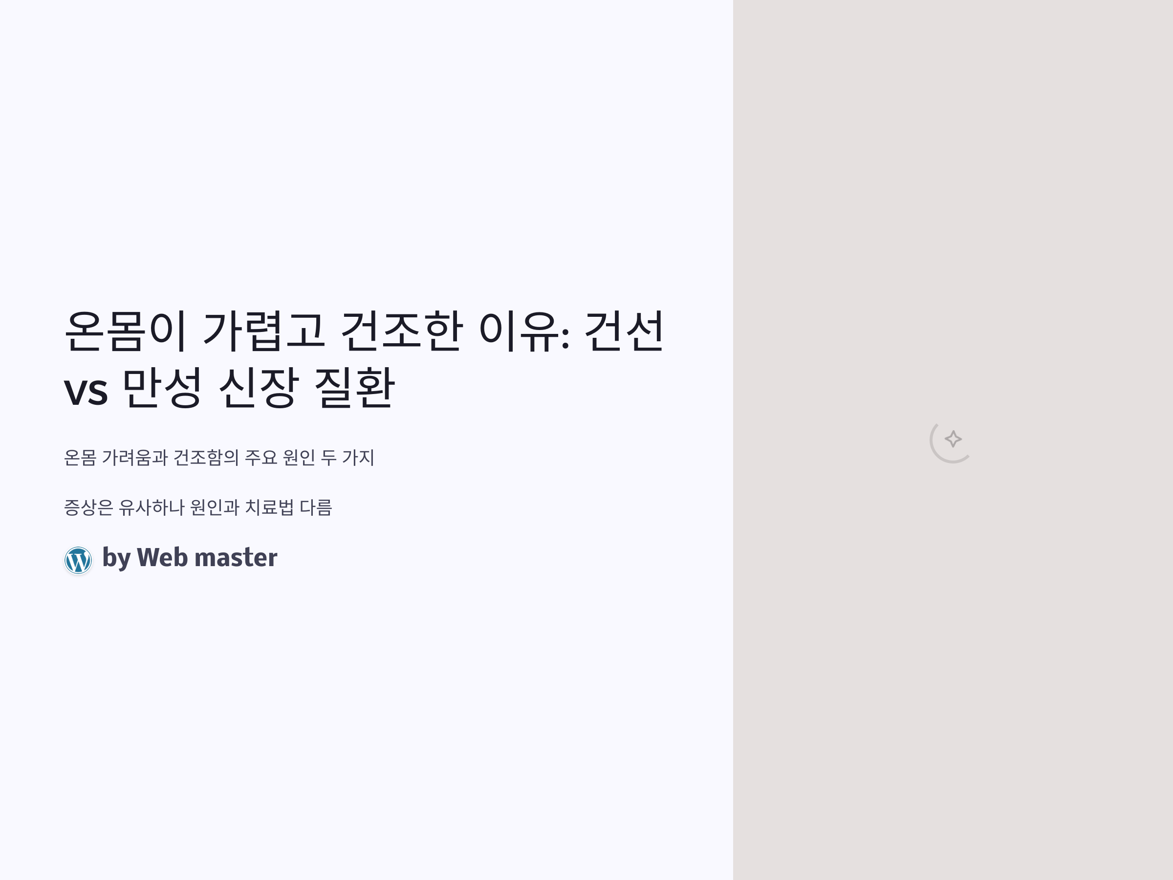 온몸이 가렵고 건조한 증상은 많은 사람들이 경험할 수 있는 문제로, 그 원인은 여러 가지가 있을 수 있습니다. 특히 건선과 만성 신장 질환은 가려움증과 피부 건조를 유발하는 주요 질환 중 두 가지입니다. 이 두 질환은 유사한 증상을 보일 수 있어, 혼동할 가능성도 있습니다. 하지만 각각의 질환은 발생 원인과 치료 방법에서 차이가 있습니다. 이번 글에서는 온몸이 가렵고 건조한 증상이 건선인지, 아니면 만성 신장 질환에 의한 것인지에 대해 구체적으로 살펴보겠습니다.