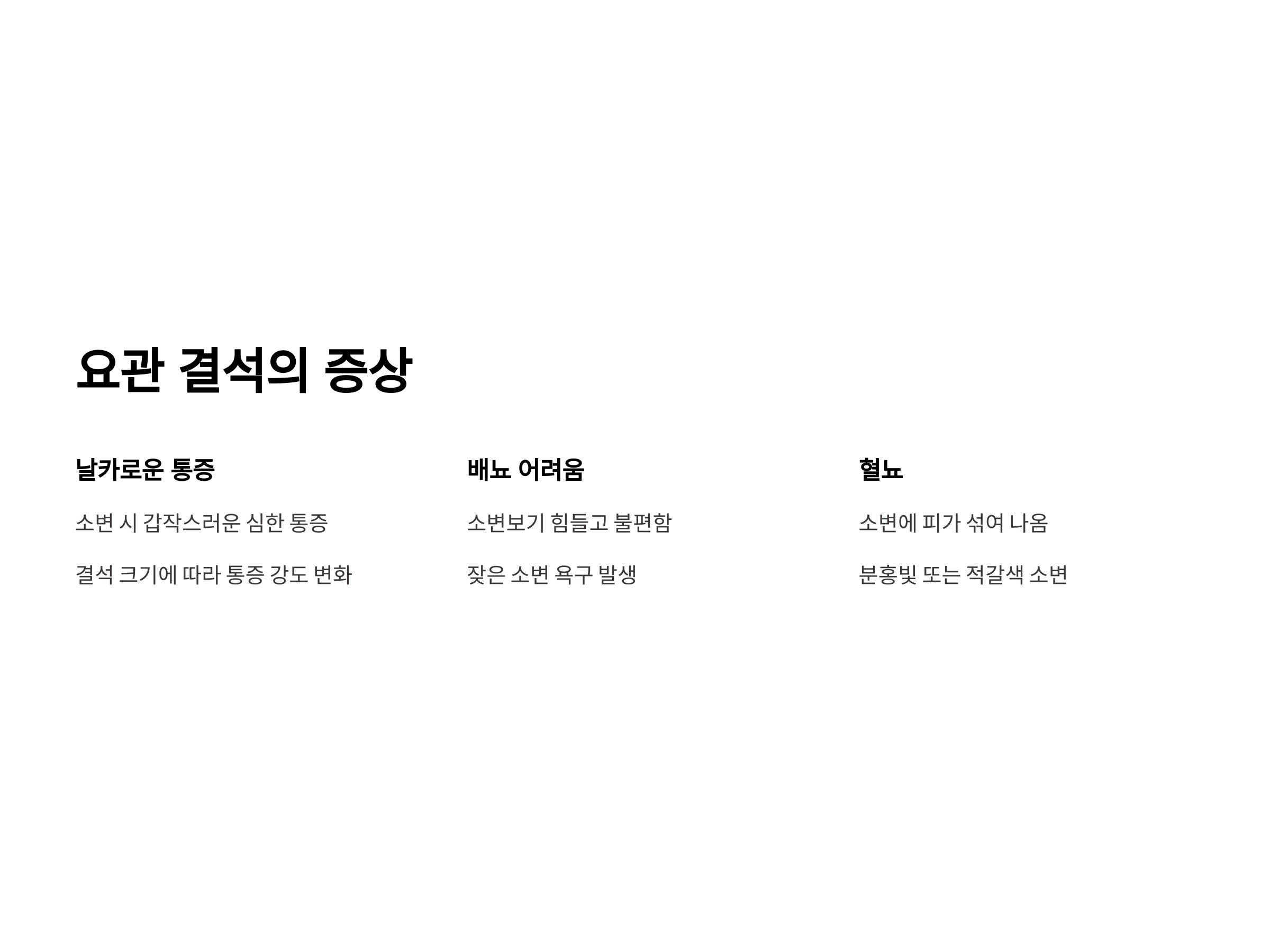 요관 결석의 증상은 다양하지만, 가장 두드러진 증상은 소변 시 통증, 배뇨의 어려움, 혈뇨(소변에 피가 섞여 나오는 현상) 등이 있습니다. 통증은 결석이 요관을 따라 이동하면서 발생하며, 이는 갑작스럽게 시작될 수 있습니다. 결석이 크면 크고 작으면 작을수록 통증의 강도나 빈도는 달라지며, 결석이 떨어져 나가기까지는 시간이 걸릴 수 있습니다.