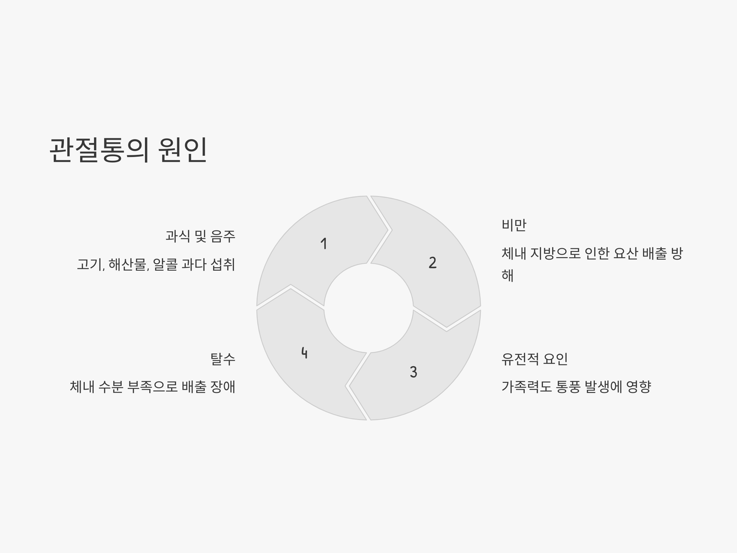 이러한 원인들이 복합적으로 작용하면서, 체내 요산 농도가 높아지게 되고, 결국 관절에 통증을 유발하는 상황이 발생합니다.