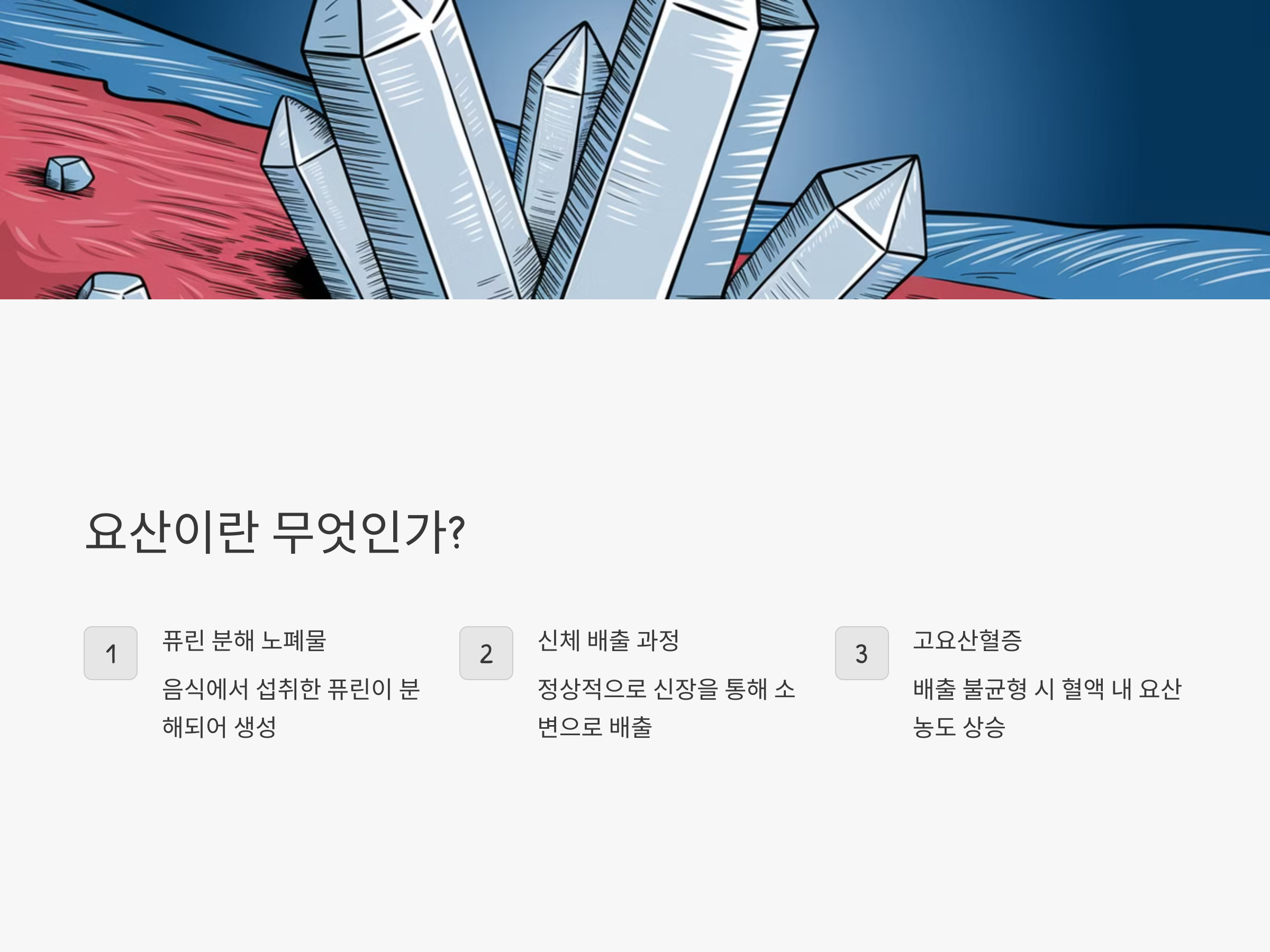 요산은 체내에서 퓨린이라는 물질이 분해되면서 생성되는 노폐물입니다. 퓨린은 주로 우리가 섭취하는 음식, 특히 고기, 해산물, 그리고 특정 종류의 알콜에서 많이 포함되어 있습니다. 신체는 이를 분해하여 소변으로 배출하지만, 요산이 과다하게 축적되면 여러 가지 문제가 발생할 수 있습니다.