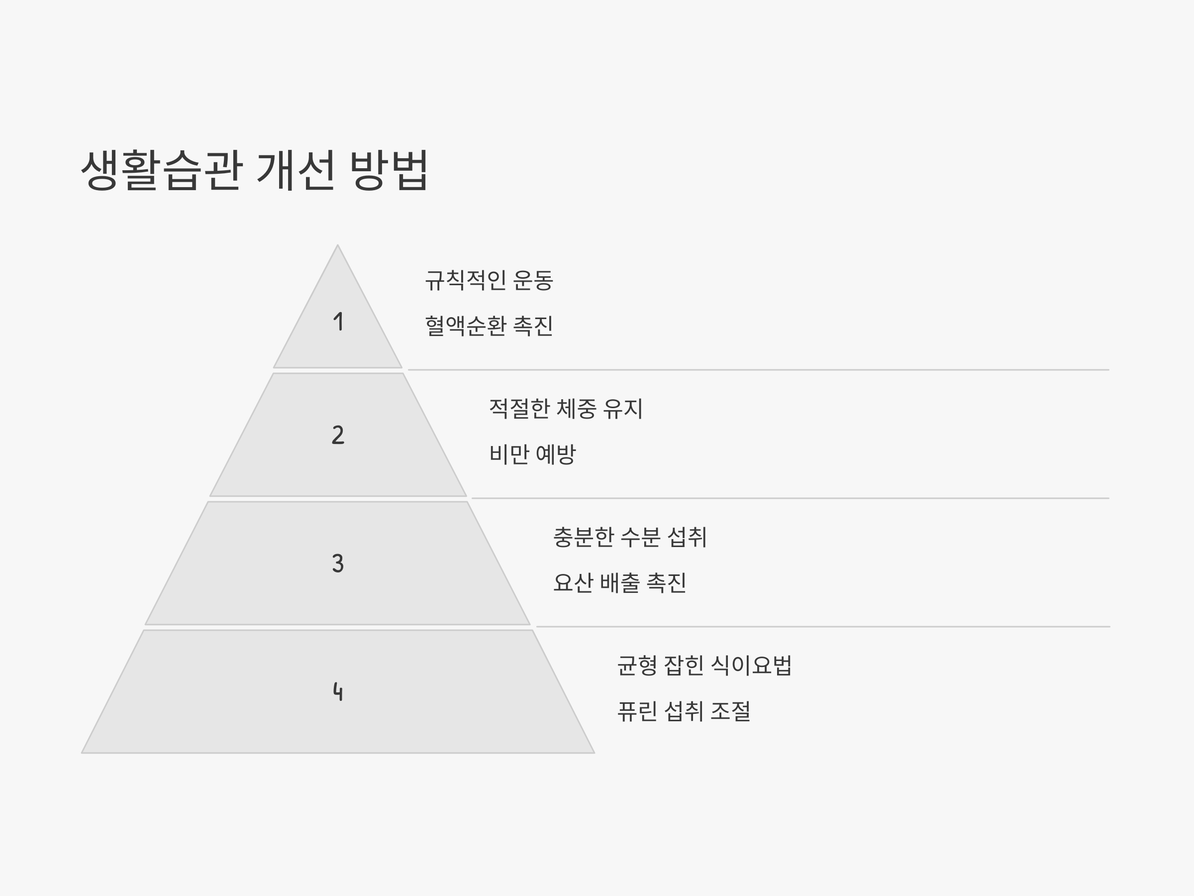 - 규칙적인 운동: 운동은 비만 예방과 더불어 혈액순환을 촉진시켜 요산 배출을 원활하게 합니다.
