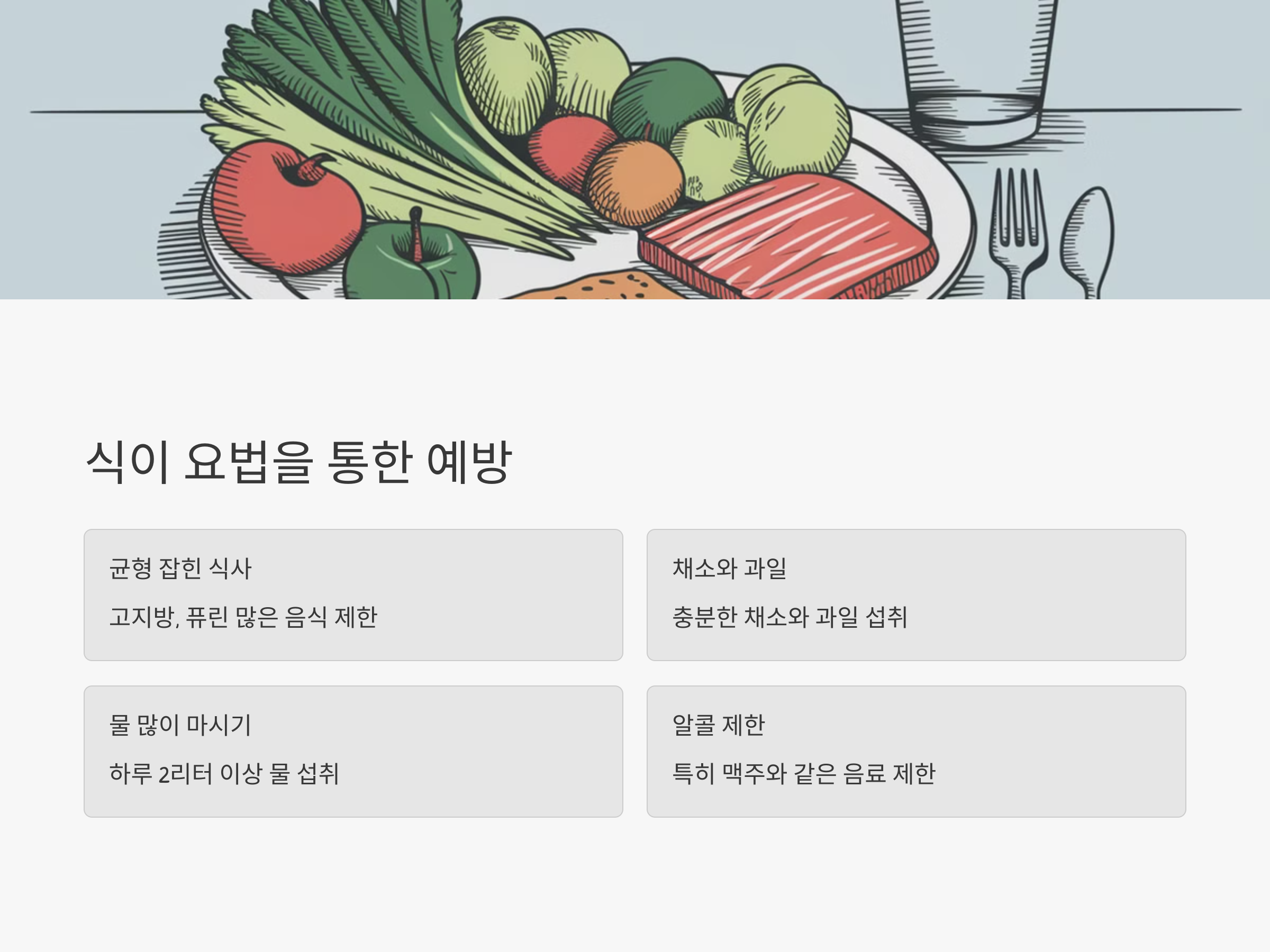 - 균형 잡힌 식사: 고지방 식사나 퓨린이 많은 음식을 과다 섭취하지 않도록 해야 합니다. 특히 고기와 해산물은 적당히 섭취하고, 채소와 과일을 많이 먹는 것이 좋습니다.