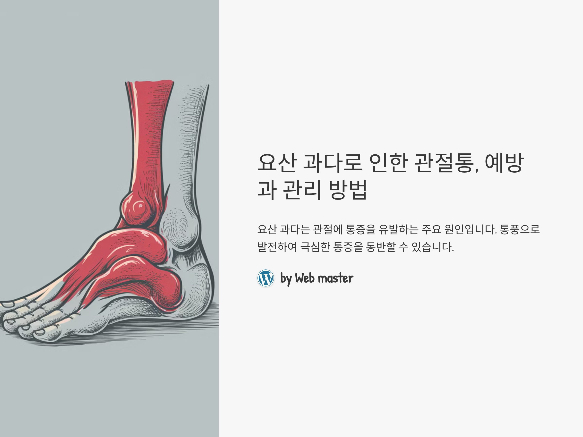 요산 과다는 우리의 건강에 심각한 영향을 미칠 수 있습니다. 특히, 관절에 통증을 유발하는 주요 원인으로 알려져 있습니다. 요산 과다가 과도하게 쌓이면 '통풍'이라는 질환을 유발할 수 있으며, 이는 관절에 급격한 염증을 일으키고, 극심한 통증을 동반하는 특징이 있습니다. 오늘은 요산 과다로 인한 관절통의 원인과 예방 방법, 그리고 치료 방법에 대해 알아보겠습니다.
