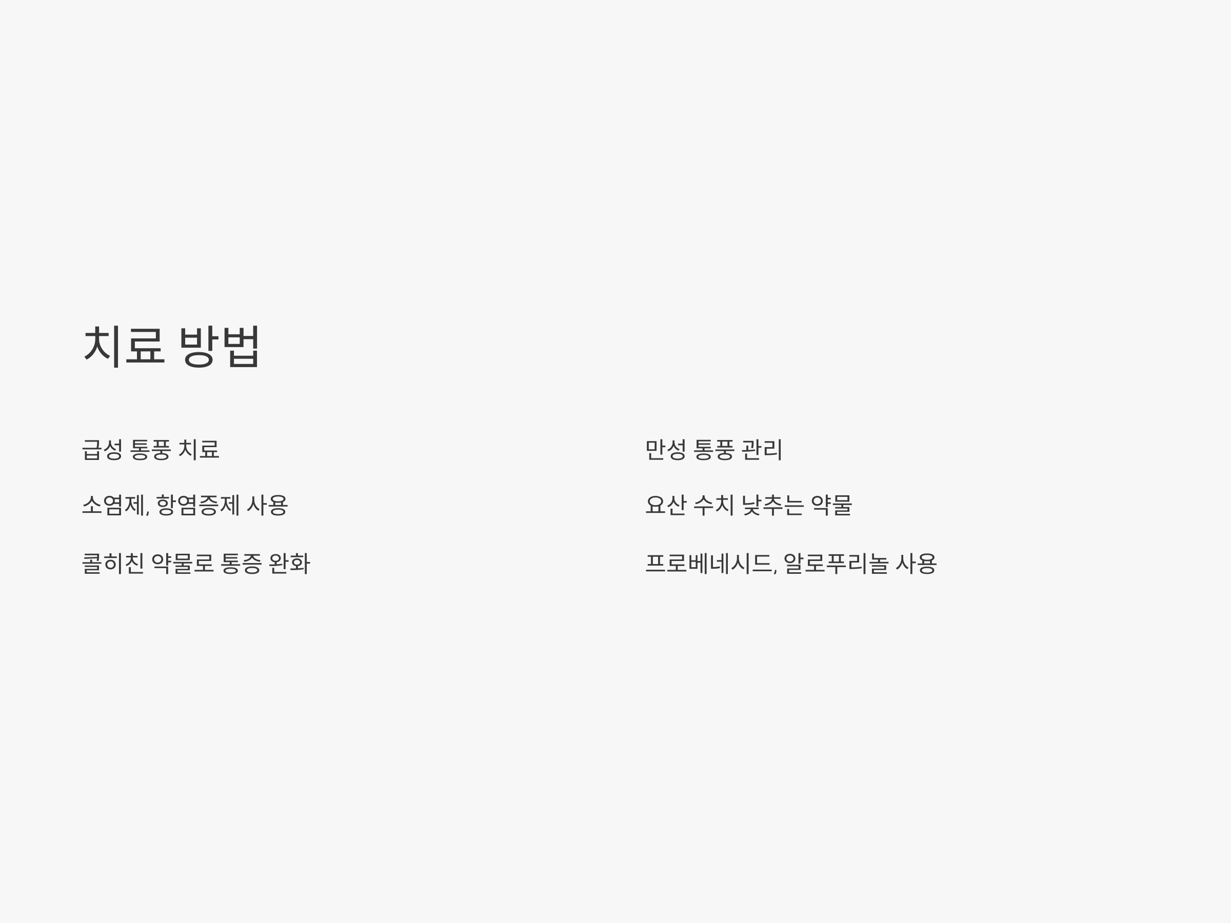 통풍이 발생하면 약물 치료와 함께 생활 습관 개선이 필요합니다. 치료는 주로 두 가지 방법으로 나누어집니다: 급성 통풍 치료와 만성 통풍 관리입니다.