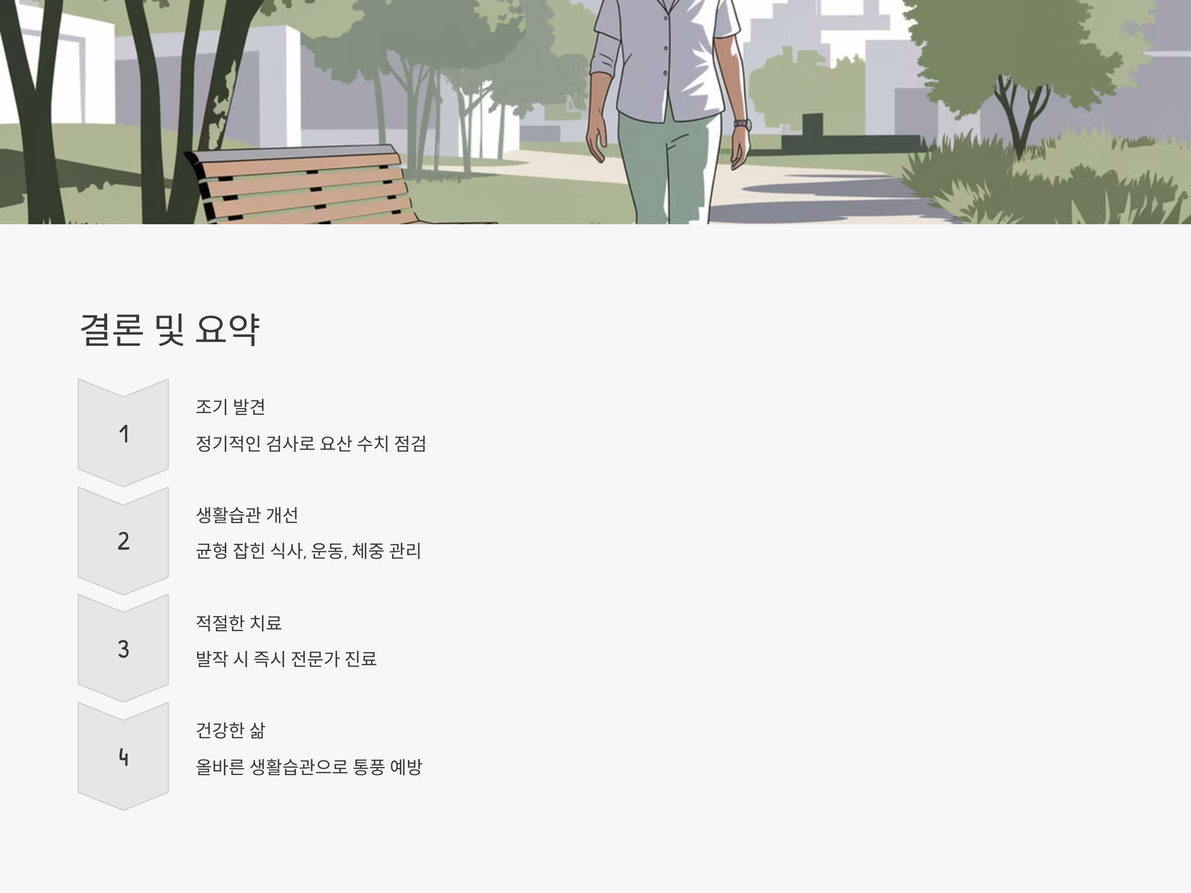 이 글에서 소개한 내용을 실천하면 요산 과다로 인한 관절통을 예방하고 건강한 삶을 유지할 수 있을 것입니다. 지금부터라도 올바른 생활습관을 실천해보세요.