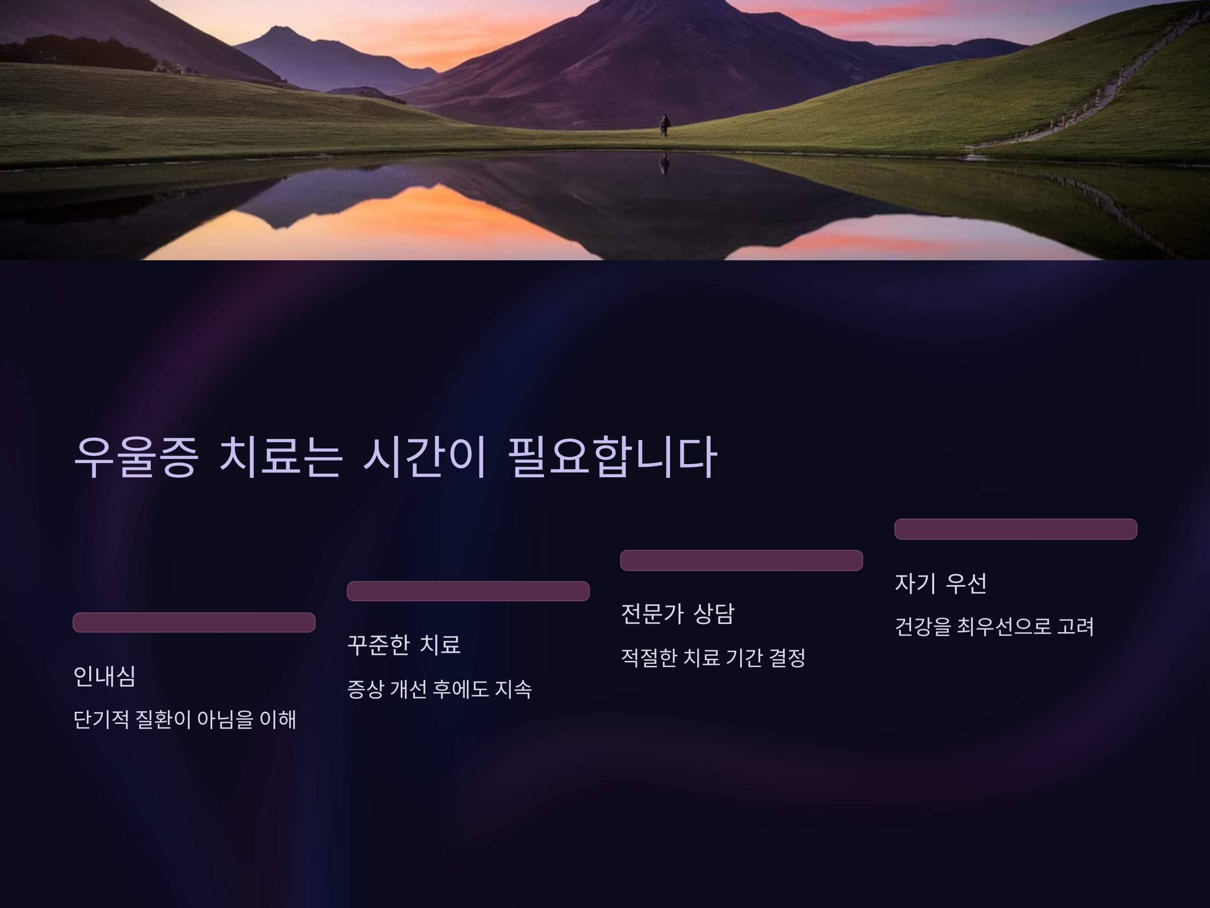 우울증은 단기적인 질환이 아니며, 치료에도 시간이 필요합니다. 심리 상담과 항우울제의 지속적인 복용은 우울증을 관리하고, 재발을 방지하는 데 필수적입니다. 우울증을 경험한 사람들은 치료를 통해 개선될 수 있지만, 치료 과정에서는 인내심과 꾸준함이 필요합니다. 증상이 개선되었다고 해서 치료를 중단하지 말고, 전문의와의 상담을 통해 적절한 기간 동안 치료를 이어가야 합니다.