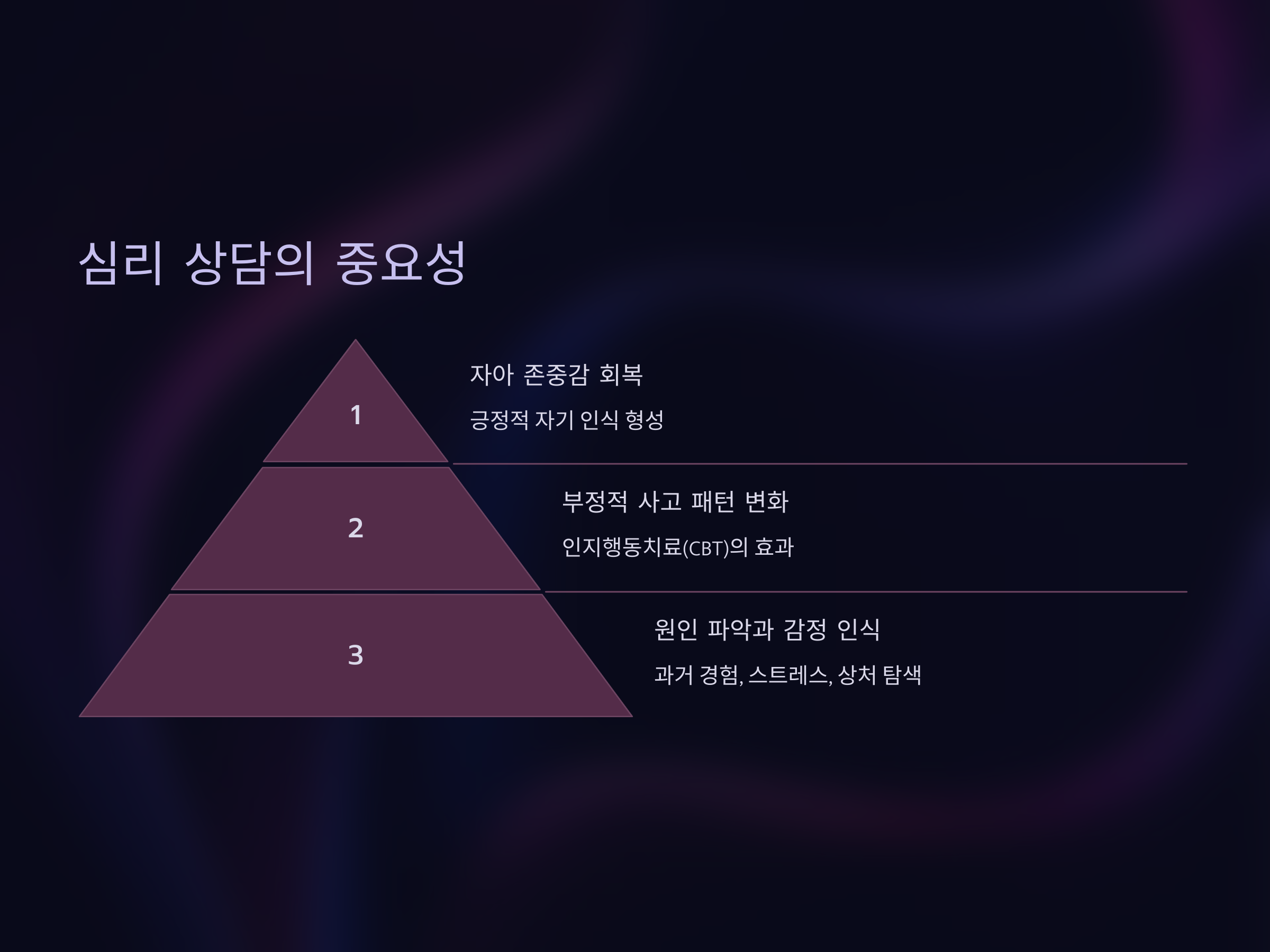 우울증의 치료에서 심리 상담은 그 어느 때보다 중요한 역할을 합니다. 우울증의 원인 중 많은 부분이 개인의 과거 경험, 스트레스, 그리고 감정적인 상처에서 비롯됩니다. 심리 상담은 이러한 심리적 원인들을 명확히 하고, 환자가 자신의 감정을 인식하고 다루는 법을 배우게 해줍니다. 상담을 통해 자아 존중감을 회복하고, 잘못된 사고방식을 바꾸는 과정은 우울증을 예방하고, 재발을 막는 데 큰 도움이 됩니다.