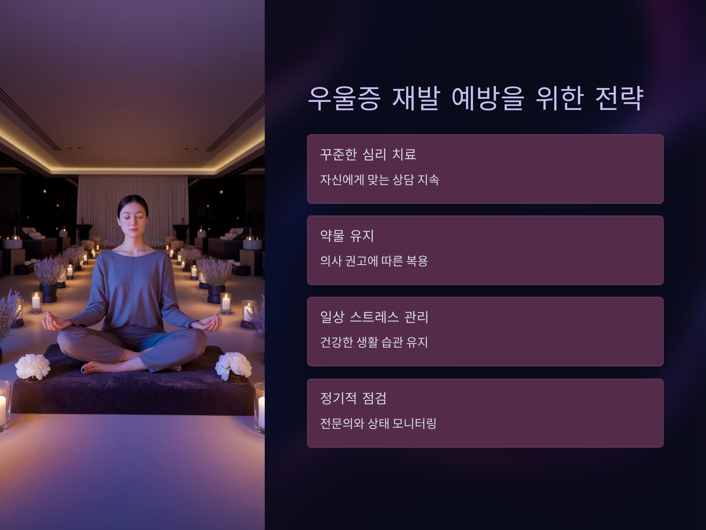 정기적인 상담과 지속적인 약물 복용은 우울증이 재발하는 것을 막는 데 중요한 역할을 합니다. 꾸준한 치료를 통해 우울증의 재발을 예방하고, 건강한 삶을 이어갈 수 있습니다.