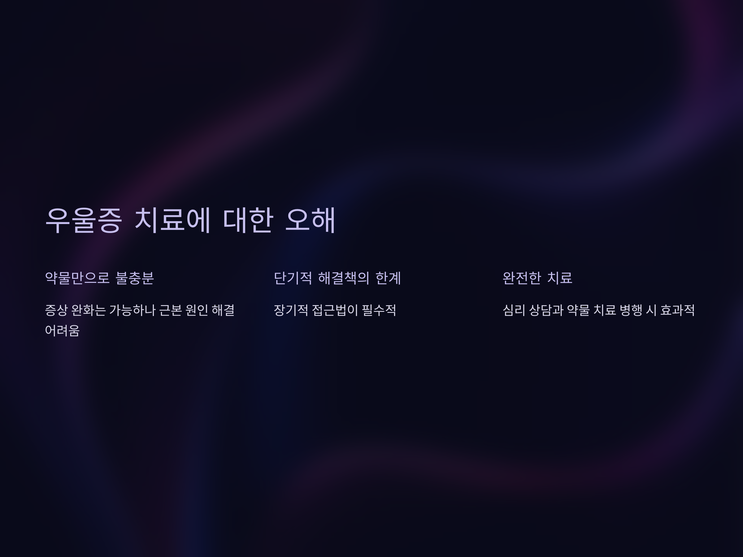 우울증 치료는 단기적인 해결책보다는 장기적인 접근이 필요합니다. 약물은 뇌의 화학적 균형을 맞추는 데 중요한 역할을 하지만, 심리적인 치료 없이는 그 효과가 제한적일 수 있습니다. 우울증을 완치하려면 심리 상담과 약물 치료가 병행되어야 합니다.