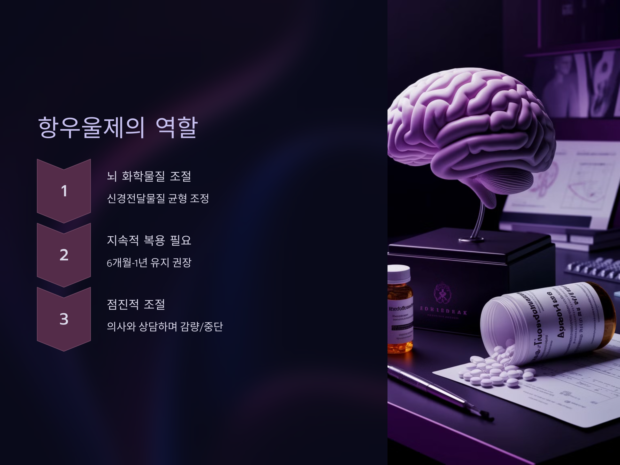 우울증은 뇌의 화학적 불균형으로 인해 발생하는 경우가 많습니다. 이때 항우울제는 뇌의 신경전달물질을 조절하여 우울증 증상을 완화하는 데 큰 역할을 합니다. 그러나 항우울제는 일시적인 해결책이 아니며, 지속적인 복용이 필요합니다. 우울증의 증상이 완화되었다고 해서 약물을 갑자기 중단하는 것은 오히려 증상을 악화시킬 수 있습니다.