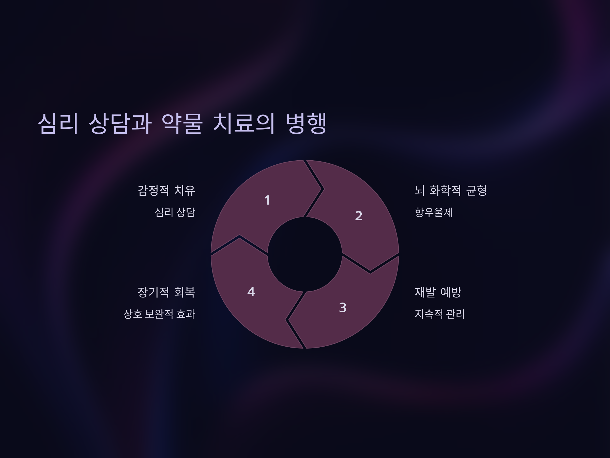 우울증의 장기 치료에는 여러 측면이 필요합니다. 첫째, 심리 상담은 우울증의 근본적인 원인과 심리적 요소를 탐구하는 과정입니다. 둘째, 항우울제는 뇌의 화학적 균형을 맞추는 데 도움이 됩니다. 이러한 두 가지 방법이 병행될 때, 우울증 치료는 더 효과적이고 지속 가능하게 이루어질 수 있습니다. 우울증을 단순히 "기분이 안 좋다"고 치부할 수 없으며, 이 질환의 치료에는 시간이 필요하고 전문적인 접근이 필수적입니다.