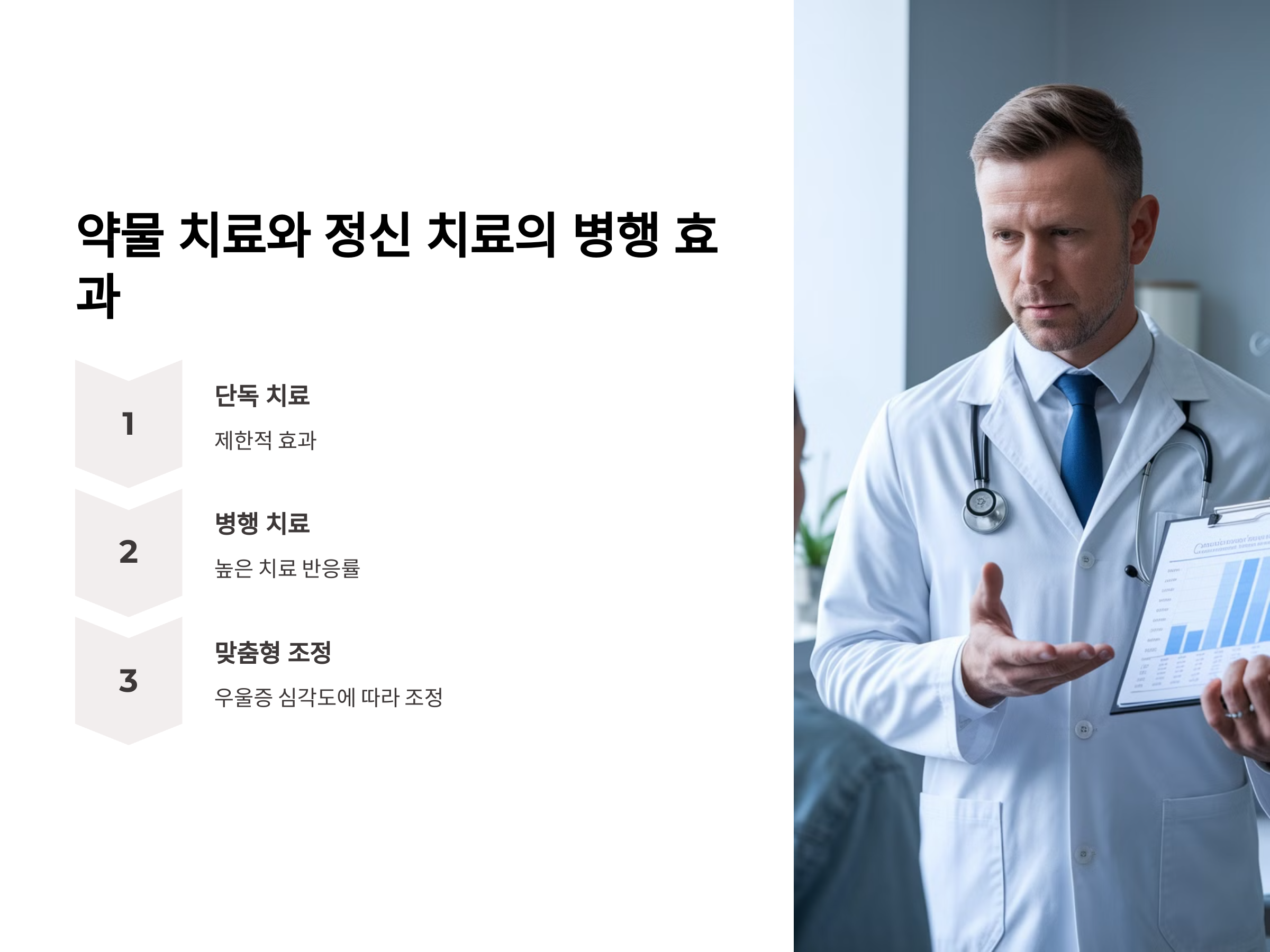 항우울제와 정신 치료를 병행하면 단독 치료보다 더 높은 치료 반응률을 보입니다. 특히, 우울증의 심각도와 개인의 상황에 따라 치료 방법을 조정하는 것이 중요합니다. citeturn0search0