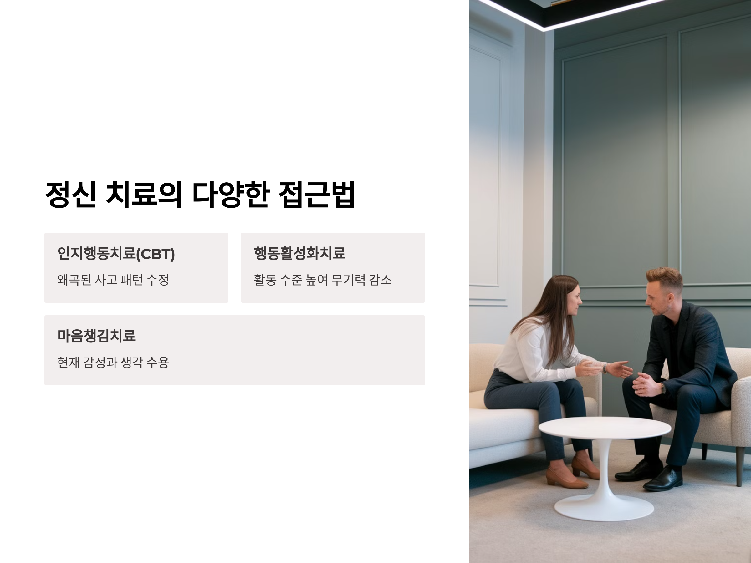 - 인지행동치료(CBT): 왜곡된 사고 패턴을 수정하고 긍정적인 행동 변화를 촉진합니다.