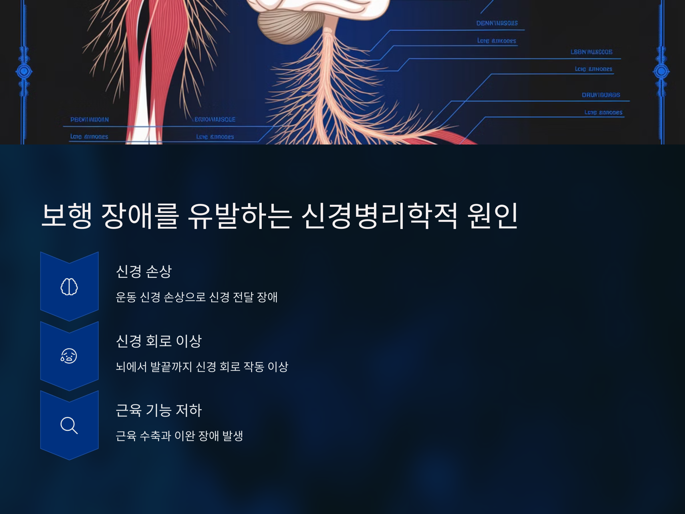 보행 장애의 가장 큰 원인은 운동 신경이 손상되면서 신경 전달이 원활하게 이루어지지 않기 때문입니다. 정상적인 보행을 위해서는 뇌에서부터 발끝까지의 신경 회로가 완벽하게 작동해야 합니다. 하지만 운동 신경병증이 발생하면 이 신경 회로가 정상적으로 작동하지 않게 되어, 신경계에서 근육으로의 명령 전달에 지연이 발생하거나 전혀 이루어지지 않게 됩니다.