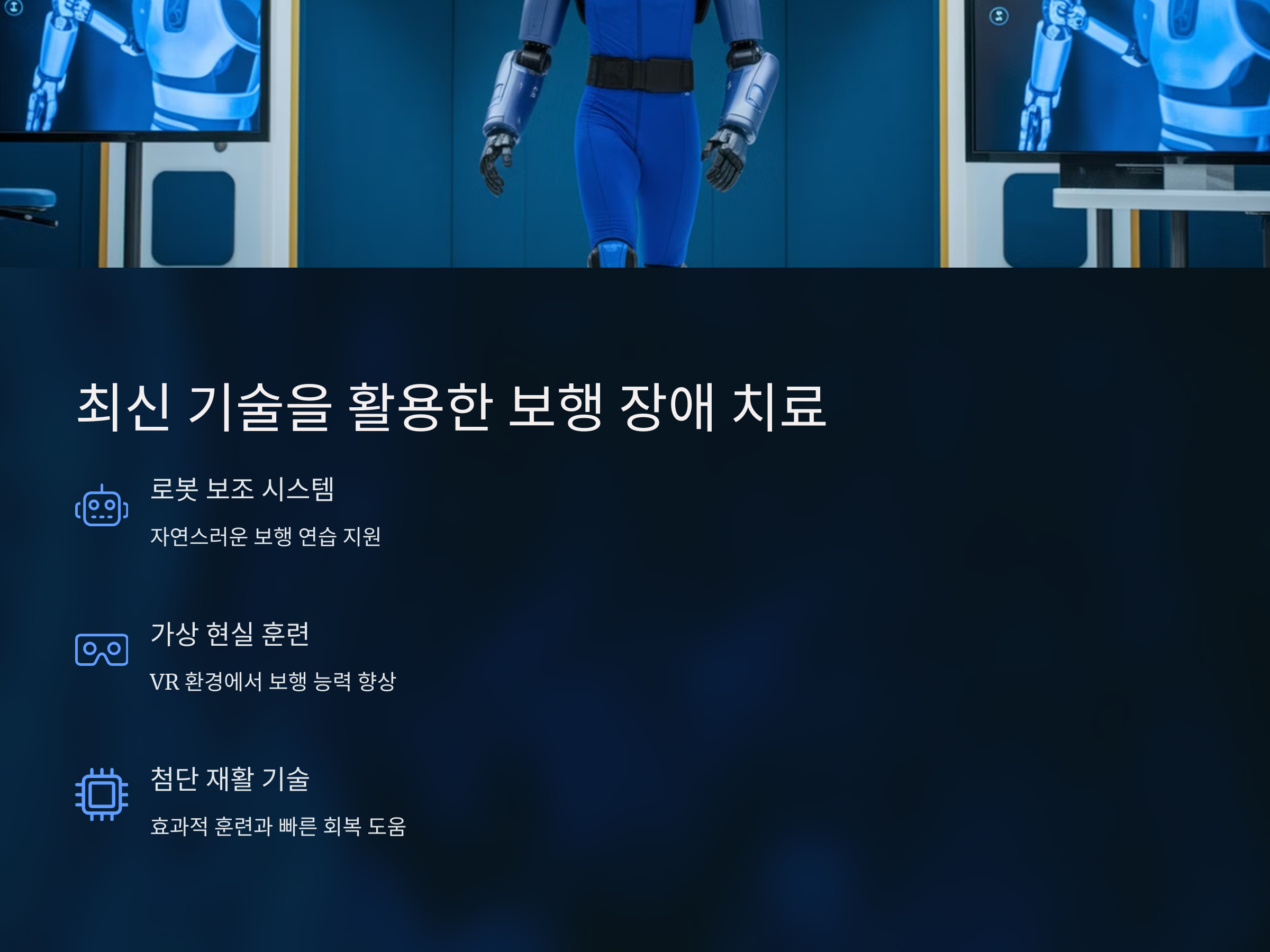 또한, VR 기술을 활용한 보행 훈련은 환자가 가상 현실 환경에서 걷는 훈련을 할 수 있게 해주며, 이는 실생활에서의 보행 능력을 향상시키는 데 큰 도움이 됩니다. 이러한 첨단 기술들은 환자들에게 보다 실용적이고 효과적인 치료 방법을 제공하는 동시에, 치료의 즐거움과 동기 부여를 높여줍니다.