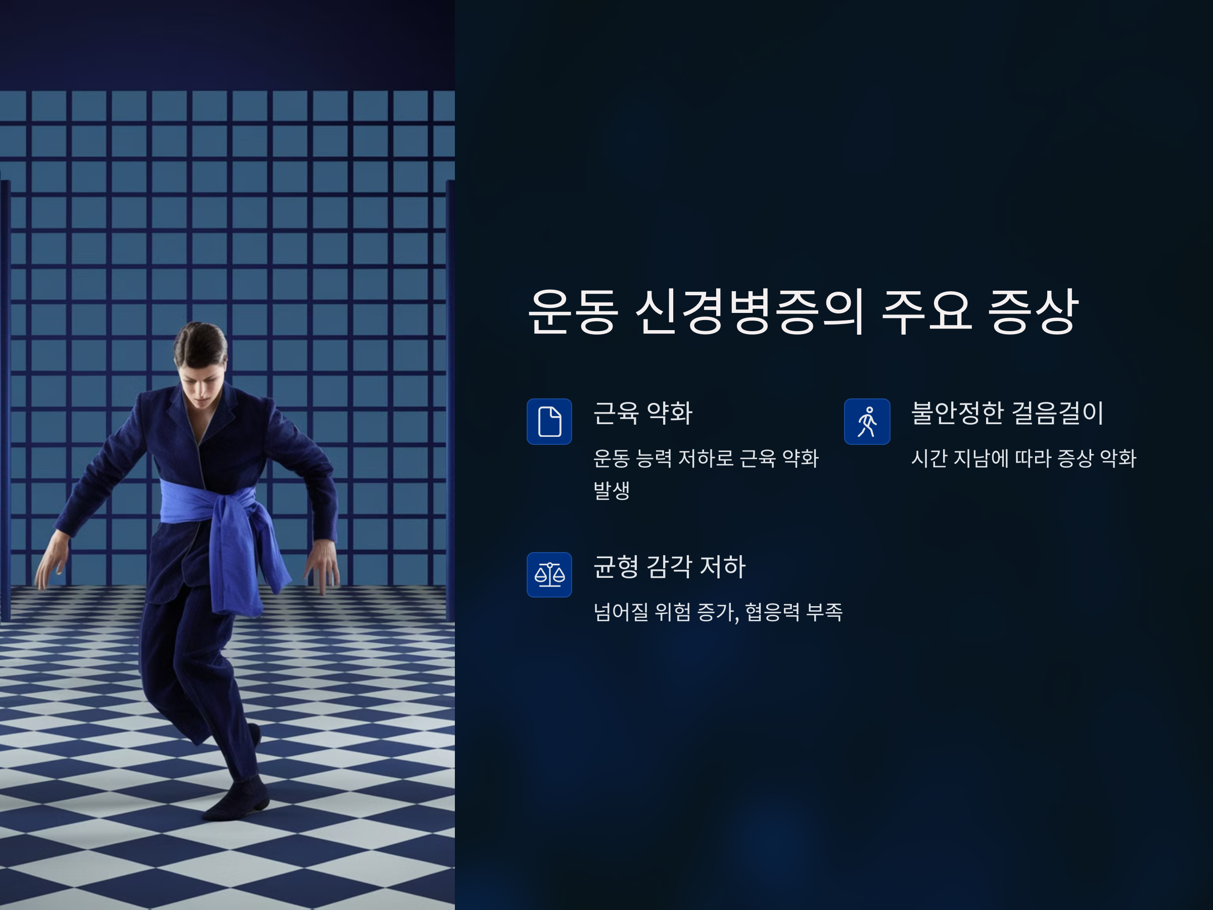 운동 신경병증의 대표적인 증상은 보행 장애 외에도 다양한 신경학적 문제가 함께 발생할 수 있습니다. 운동 능력의 저하로 인해 근육의 약화가 발생하고, 이로 인해 걸음걸이가 불안정해집니다. 초기에는 가벼운 보행 문제로 시작될 수 있지만 시간이 지남에 따라 점차적으로 증상이 악화되며, 걷는 것 자체가 어려워질 수 있습니다.