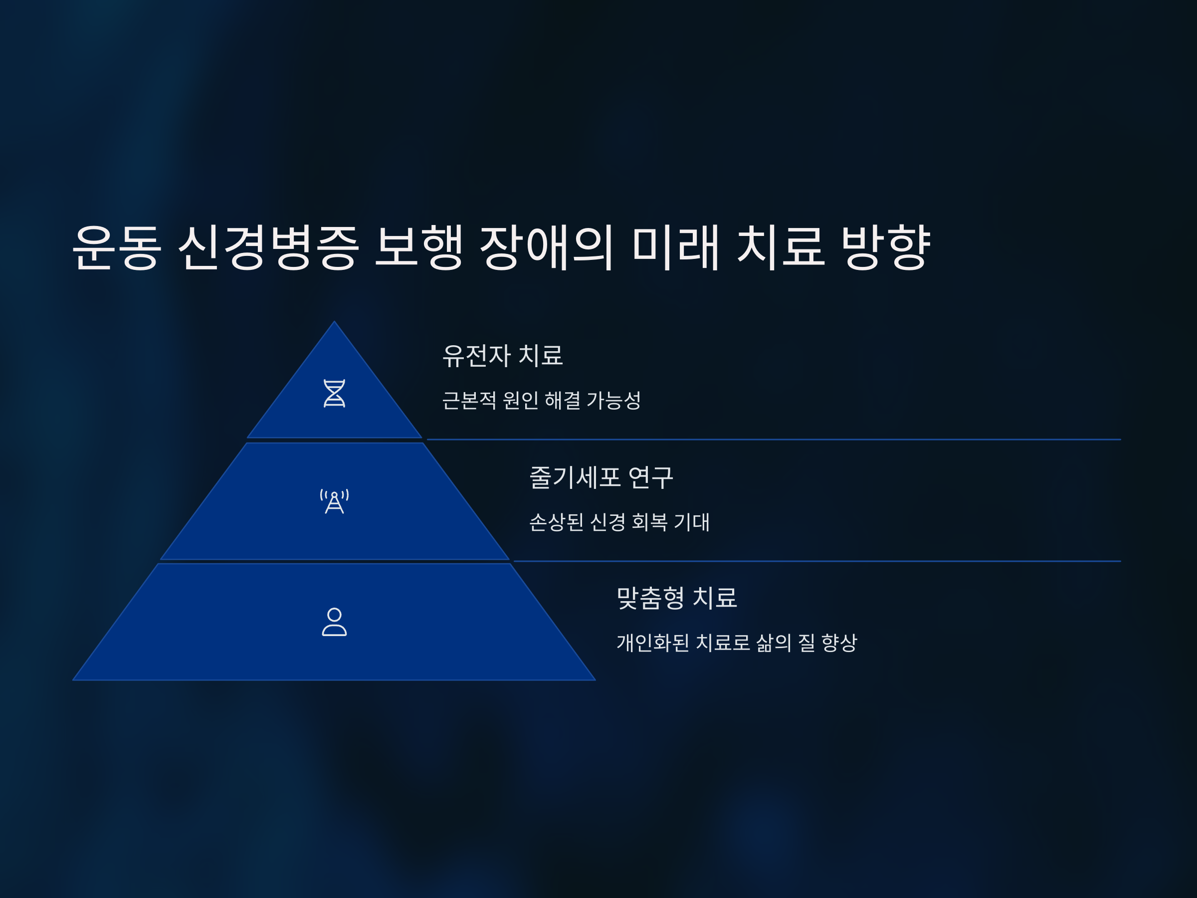 운동 신경병증으로 인한 보행 장애의 치료는 지속적으로 발전하고 있으며, 앞으로도 다양한 혁신적인 치료법들이 개발될 것입니다. 현재까지의 치료 방법들은 주로 증상을 완화하고 기능을 보조하는 데 초점을 맞추고 있지만, 향후에는 신경 세포 재생을 촉진하거나, 손상된 신경을 회복시키는 치료 방법이 나올 가능성이 큽니다.
