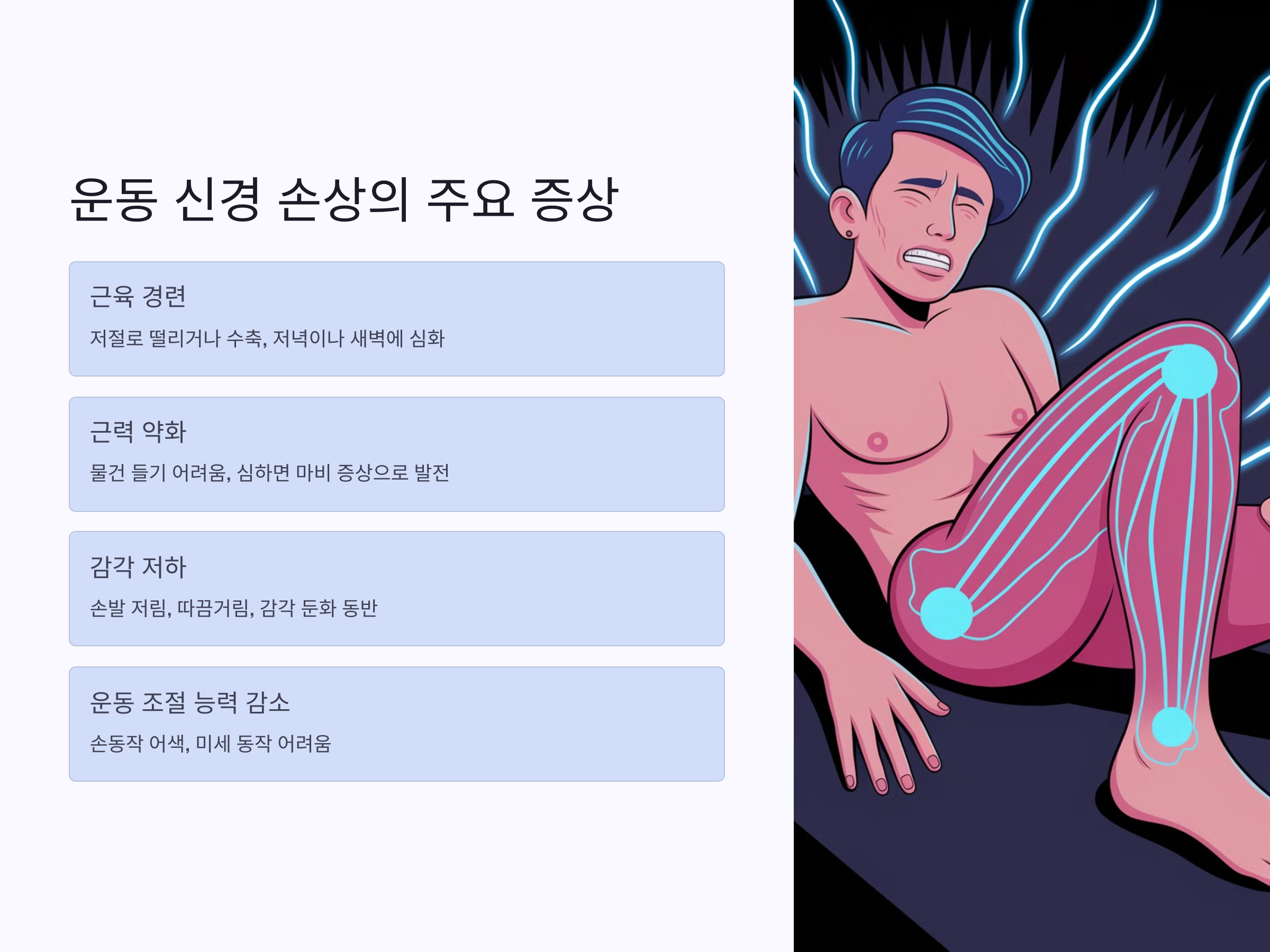 운동 신경 손상은 감각 신경에도 영향을 미칠 수 있어 손발 저림, 따끔거림, 감각 둔화 등이 동반될 수 있습니다.