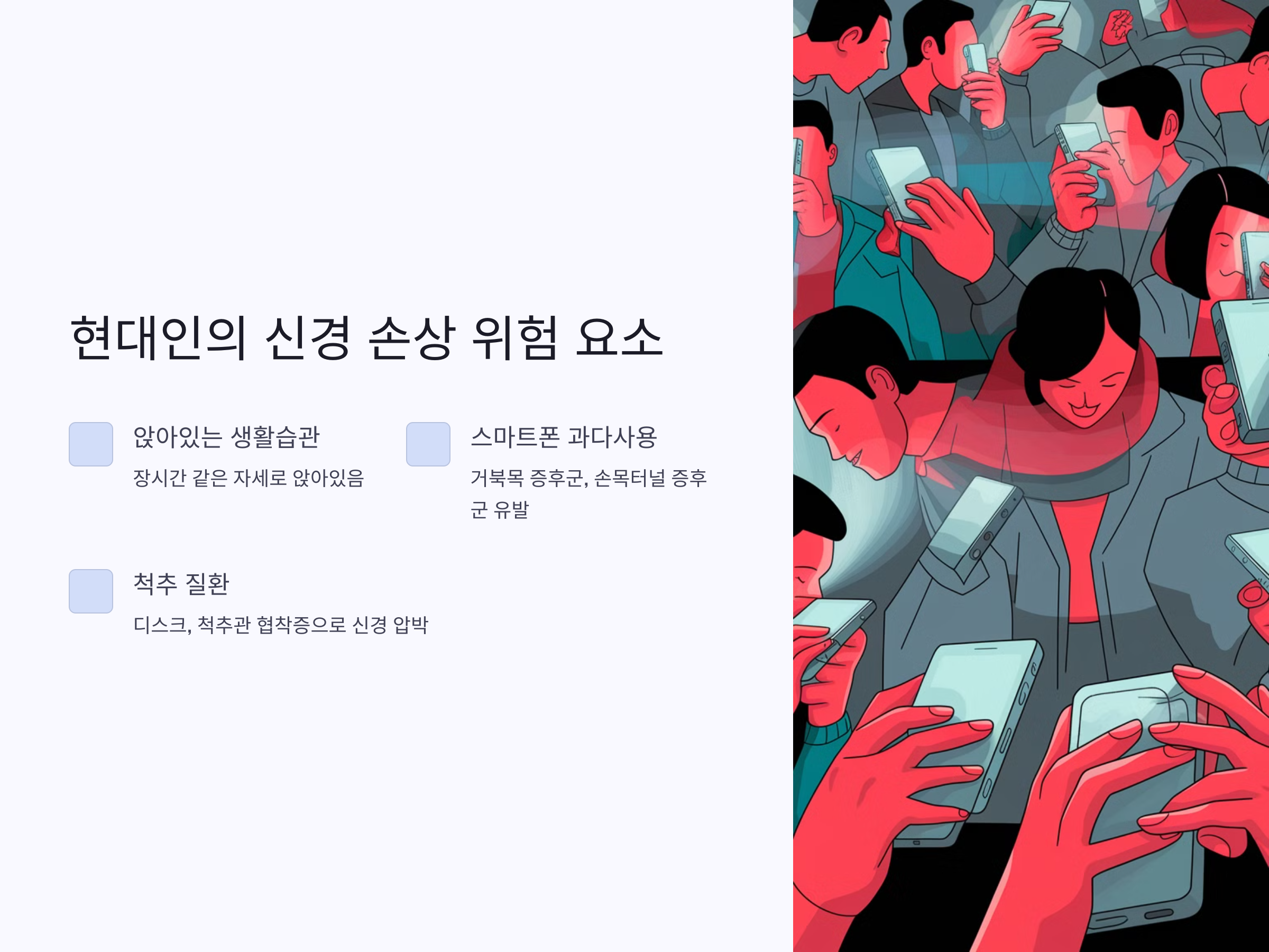잘못된 자세, 운동 부족, 장시간 스마트폰 사용 등이 신경 압박을 유발할 수 있습니다. 예를 들어, 목 디스크나 허리 디스크가 진행되면 신경이 눌려 근육 경련과 근력 저하를 일으킬 수 있습니다.