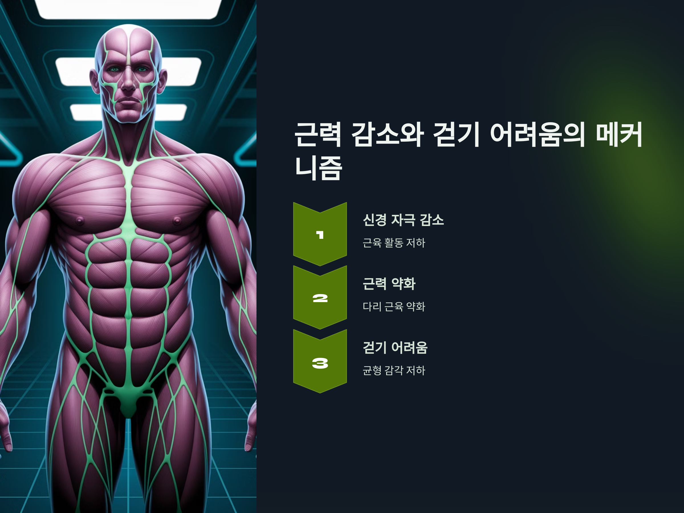 근력 감소는 걷는 데 필요한 근육의 힘을 약화시키며, 특히 다리 근육의 약화는 걸음걸이에 큰 영향을 미칩니다. 또한, 근육의 약화는 균형 감각에도 영향을 미쳐 넘어지거나 다칠 위험이 증가할 수 있습니다. 결과적으로, 환자는 점차적으로 일상생활에서 걷는 것이 어려워지며, 휠체어나 보행 보조 기기 등을 사용해야 할 수도 있습니다.