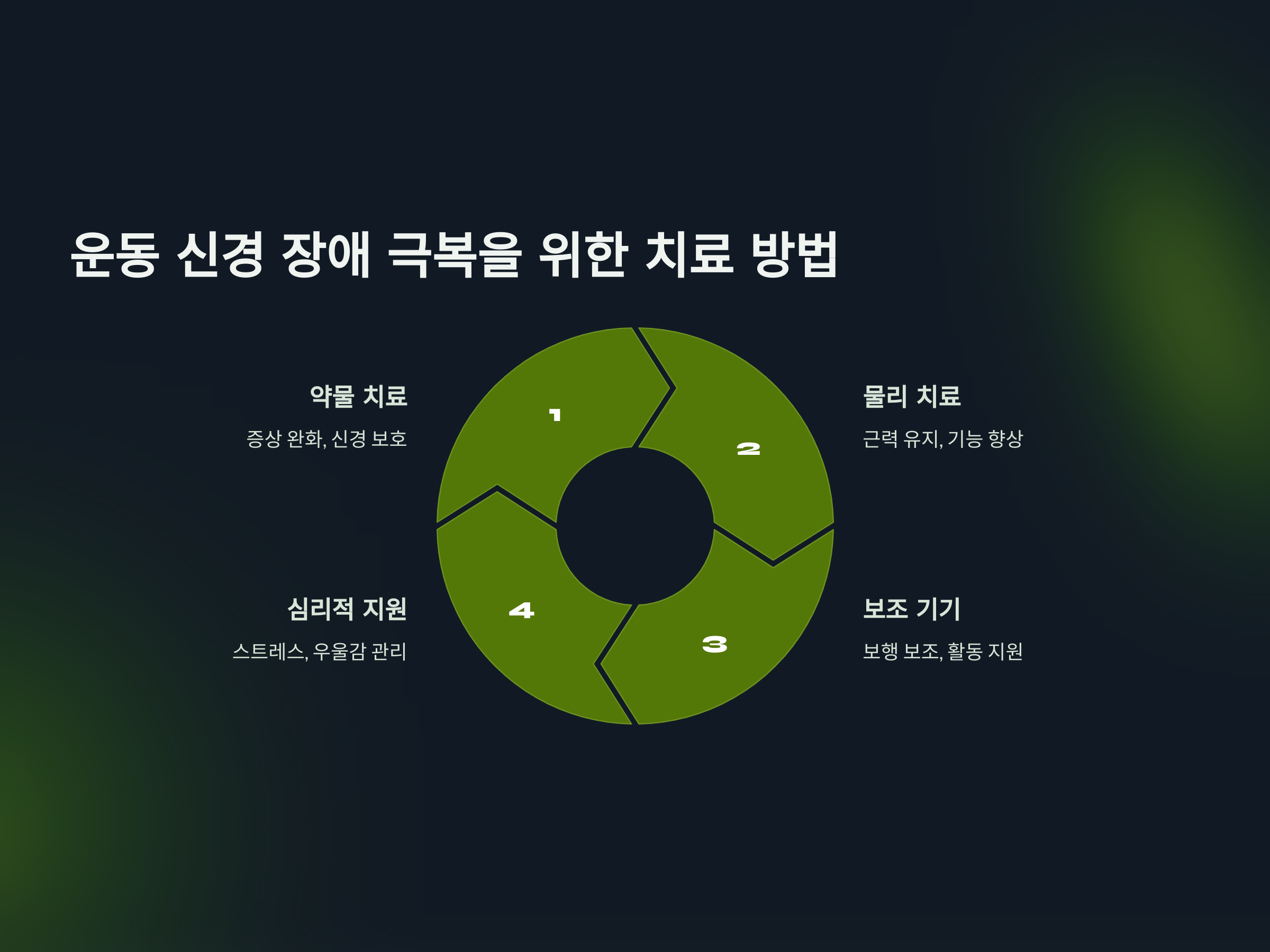 운동 신경 장애의 원인에 따라 치료가 어려운 경우도 있습니다. 예를 들어, 근위축성 측삭 경화증(ALS)은 현재로서는 완치가 어려운 질환으로, 주로 증상 완화와 진행 억제를 목표로 치료가 이루어집니다.