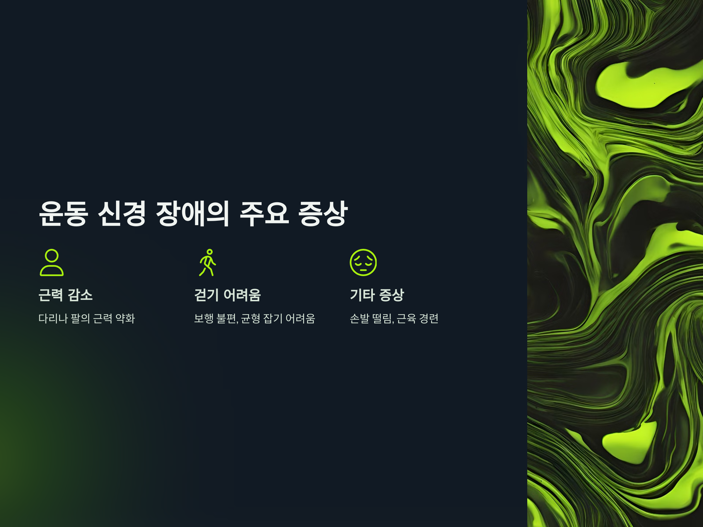 운동 신경 장애는 신경 전달의 문제로 인해 근육의 수축이나 움직임에 장애가 생기기 때문에 근력 감소와 걷기 어려움 외에도 다양한 증상을 유발할 수 있습니다. 가장 일반적인 증상은 다리나 팔의 근력이 점차 약해지며, 걷는 것이 어렵거나 불편해지는 것입니다. 처음에는 가벼운 증상으로 시작하지만 점차 악화되어 일상적인 활동에 지장을 줄 수 있습니다.