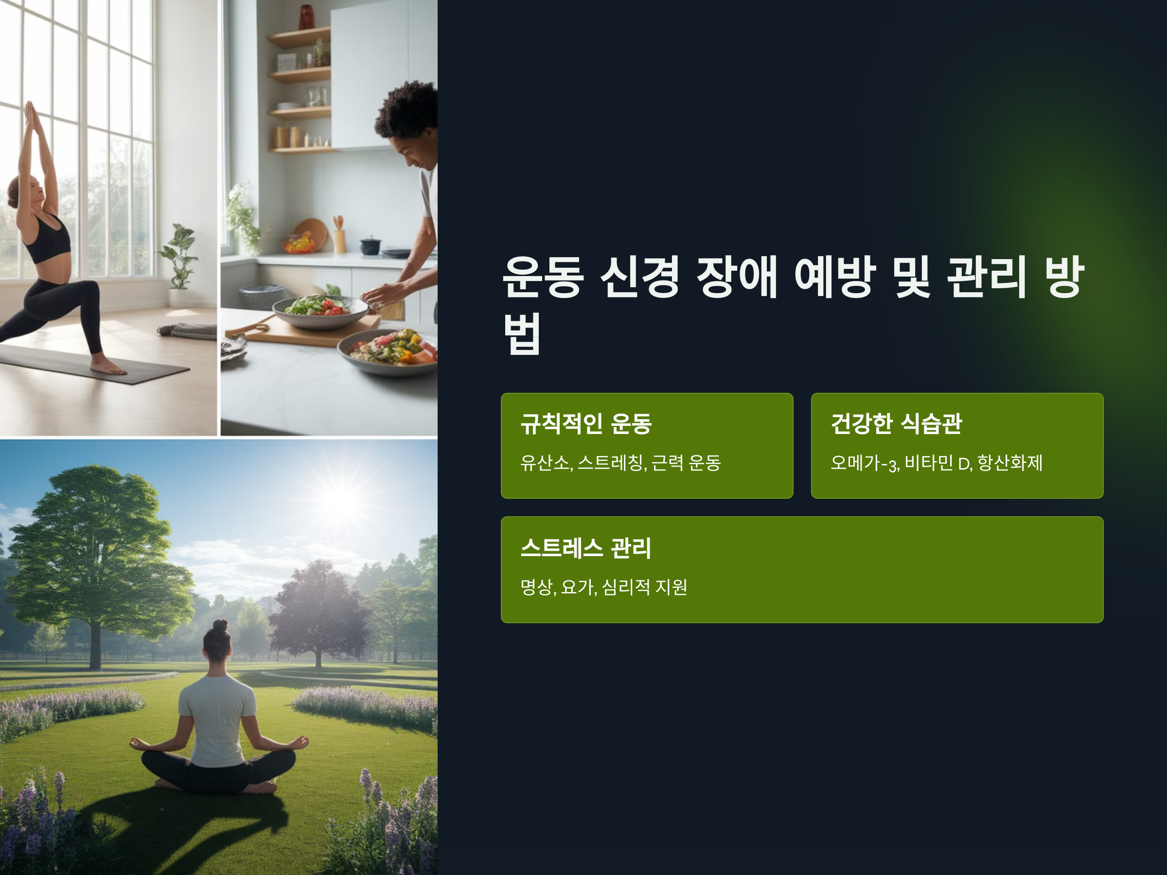운동 신경 장애의 원인이 유전적일 경우, 이를 완전히 예방하는 것은 어렵지만, 건강한 생활습관을 유지함으로써 일부 증상을 늦추거나 예방할 수 있는 방법들이 있습니다.