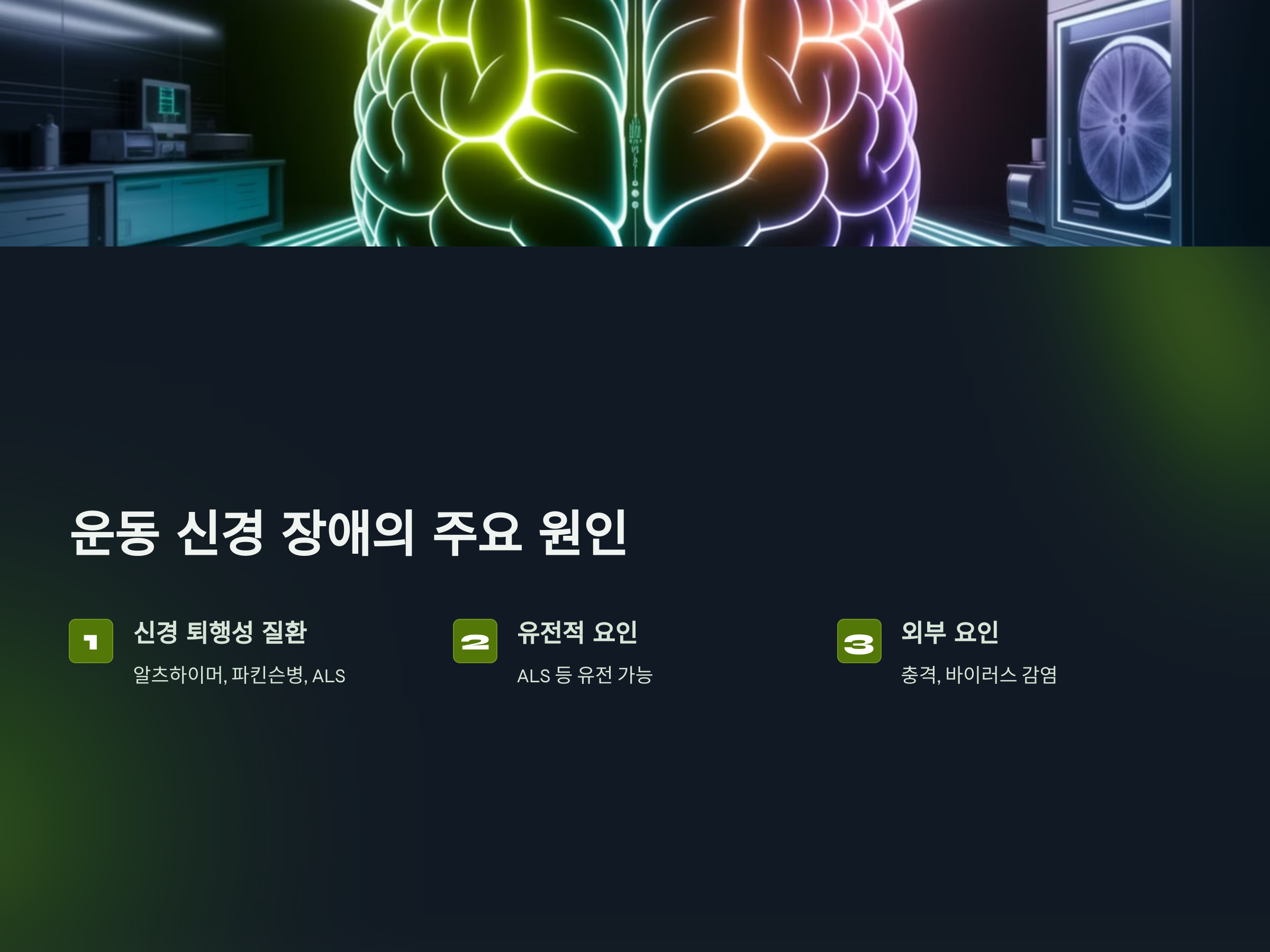 운동 신경 장애는 여러 가지 원인에 의해 발생할 수 있습니다. 가장 흔한 원인으로는 신경 퇴행성 질환이 있습니다. 알츠하이머, 파킨슨병, 근위축성 측삭 경화증(ALS) 등은 신경 세포에 영향을 미쳐 운동 신경에 문제가 생깁니다. 또한, 유전적 요인이나, 외부 충격, 그리고 바이러스 감염 등이 신경 장애를 유발할 수 있습니다. 이 외에도 신경 염증, 약물 부작용 등도 운동 신경 장애의 원인으로 작용할 수 있습니다.