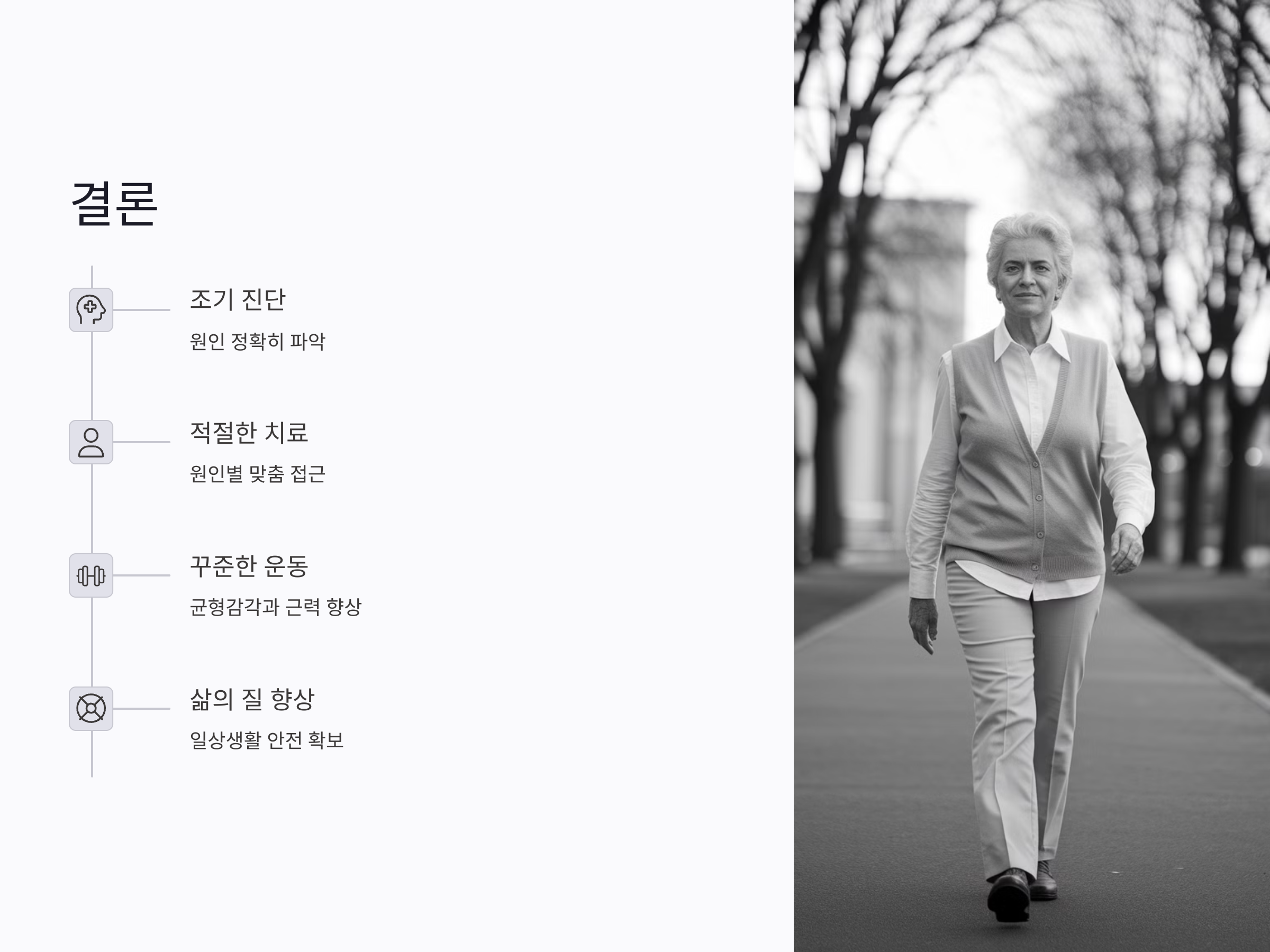 운동 실조와 걸음걸이 불안정은 다양한 원인에 의해 발생할 수 있으며, 이를 해결하기 위해서는 원인을 정확히 진단하고 적절한 치료와 운동을 병행하는 것이 중요합니다. 신경계 질환이나 근육의 약화로 인해 발생하는 이러한 문제들은 전문가의 도움을 받아 조기에 치료하고 관리하는 것이 필요합니다. 또한, 꾸준한 재활 운동과 치료를 통해 걸음걸이를 안정적으로 개선할 수 있으며, 이는 일상생활에서의 안전을 크게 향상시킬 수 있습니다. 운동 실조가 있는 경우, 빠른 시일 내에 치료를 시작하는 것이 매우 중요합니다.