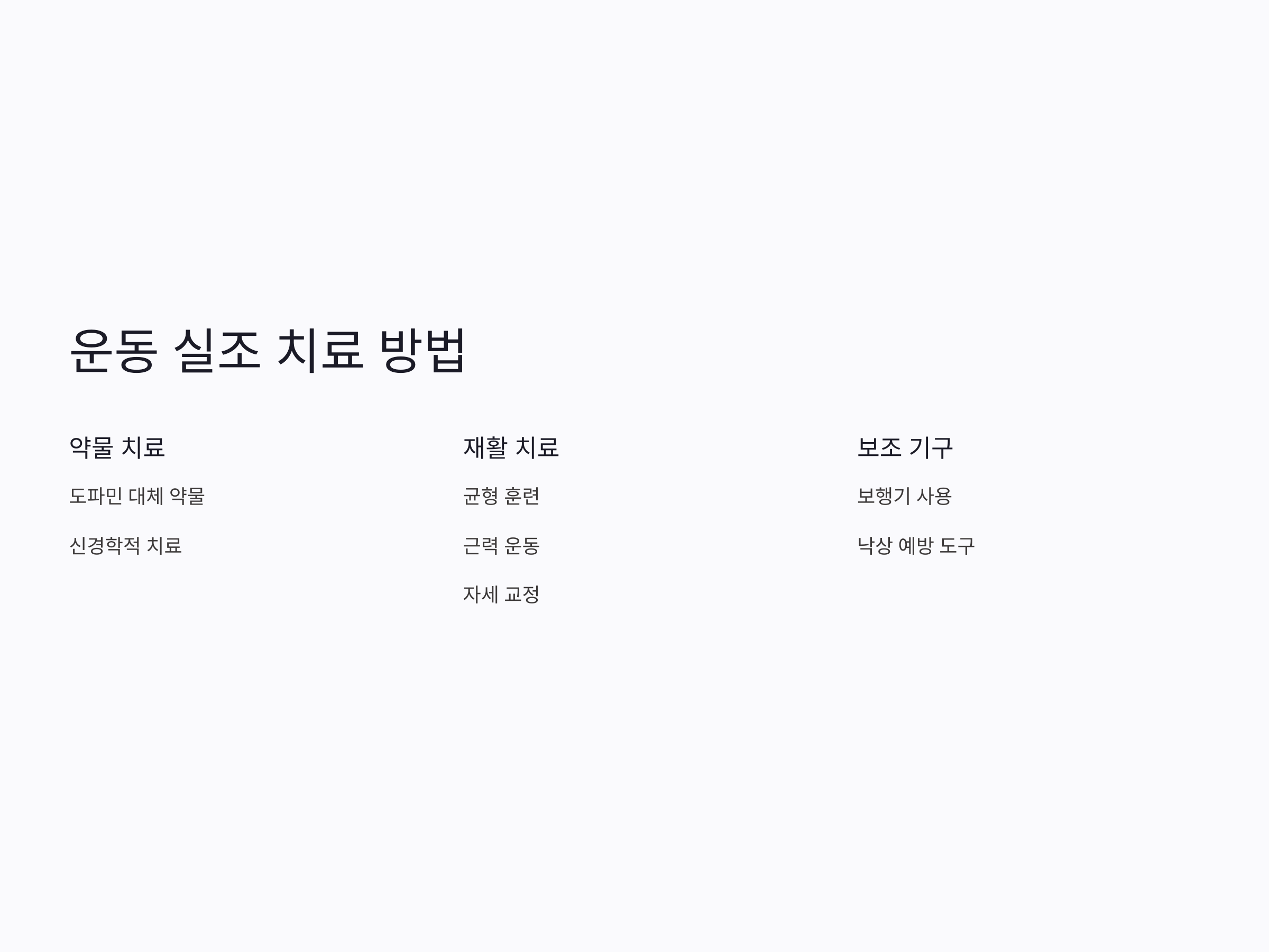 운동 실조를 치료하는 방법은 원인에 따라 달라집니다. 먼저, 신경계 질환으로 인한 운동 실조가 원인이라면 약물 치료가 필요할 수 있습니다. 예를 들어, 파킨슨병의 경우 도파민 대체 약물이나 기타 신경학적 치료가 사용됩니다. 또한, 뇌졸중 후유증이라면 재활 치료를 통해 근육의 운동 범위와 조정 능력을 회복할 수 있습니다.