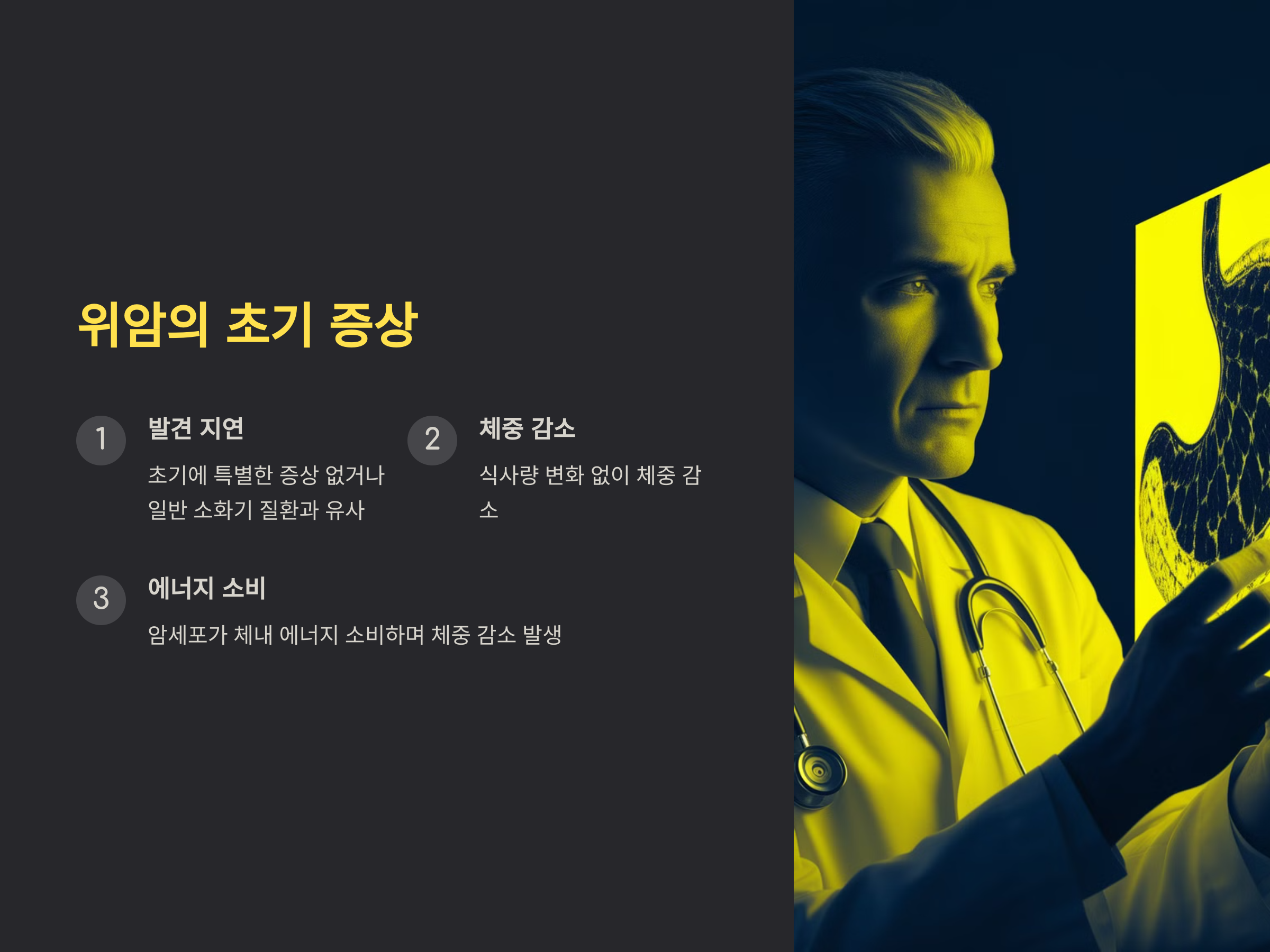 위암은 초기 단계에서 특별한 증상이 나타나지 않거나, 일반적인 소화기 질환과 유사한 증상으로 인해 발견이 늦어질 수 있습니다. 그중에서도 원인 불명의 체중 감소는 위암 초기의 중요한 경고 신호 중 하나입니다. 식사량이나 생활 패턴에 변화가 없음에도 불구하고 체중이 감소한다면, 이는 위암을 의심해봐야 하는 증상입니다. 이러한 체중 감소는 암세포가 체내 에너지를 소비하면서 발생할 수 있습니다. 따라서 이러한 증상이 지속된다면 전문의와 상담하여 정확한 진단을 받는 것이 중요합니다. citeturn0search0