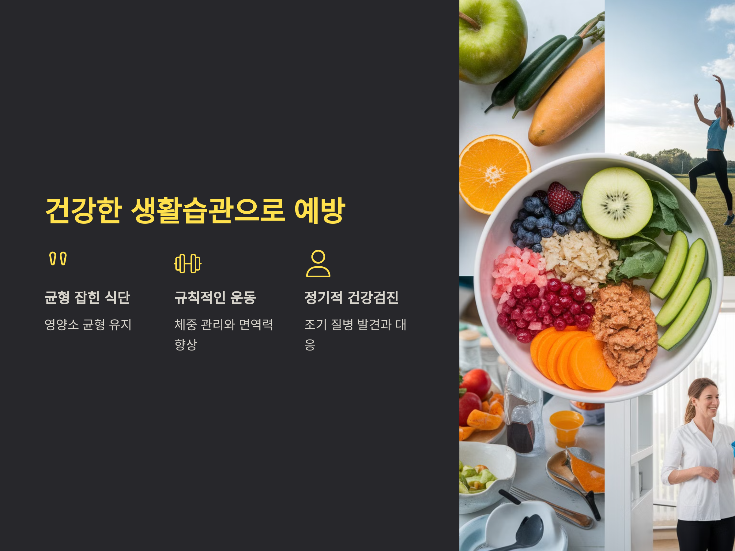 위암과 당뇨병을 예방하기 위해서는 건강한 생활습관이 중요합니다. 균형 잡힌 식단과 규칙적인 운동은 체중 관리와 면역력 향상에 도움이 됩니다. 또한, 정기적인 건강검진을 통해 조기에 질병을 발견하고 대응할 수 있습니다. 특히 가족력이나 기타 위험 요인이 있는 경우, 더욱 주의 깊게 건강 상태를 관리해야 합니다.
