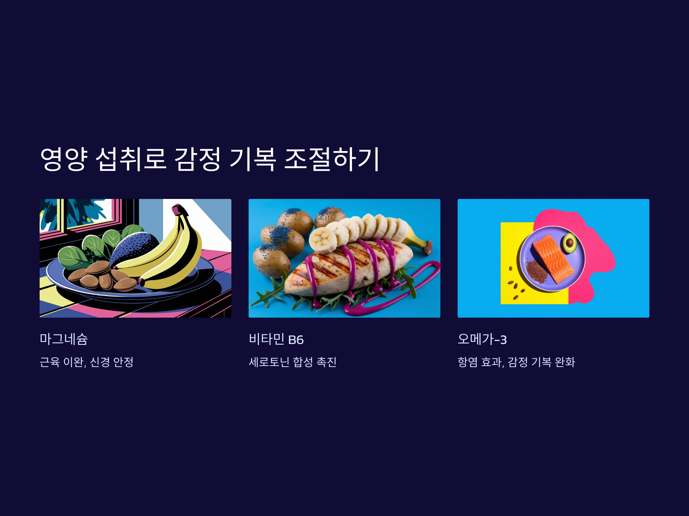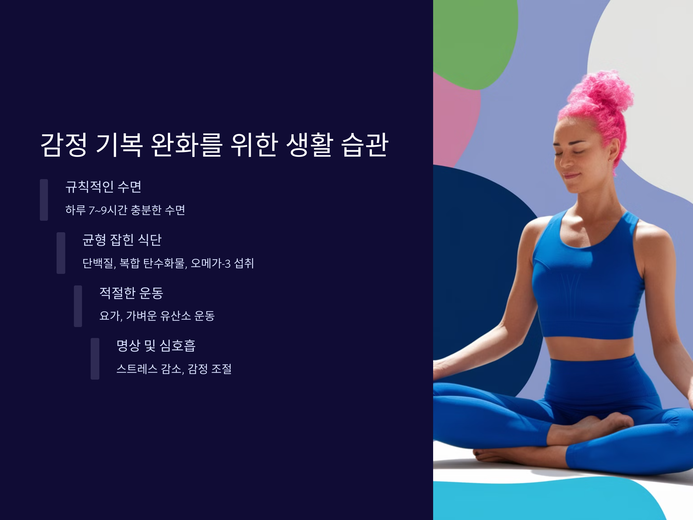 - 균형 잡힌 식단 유지: 단백질, 복합 탄수화물, 오메가-3 지방산이 풍부한 식단을 섭취하면 기분 안정에 도움이 된다.