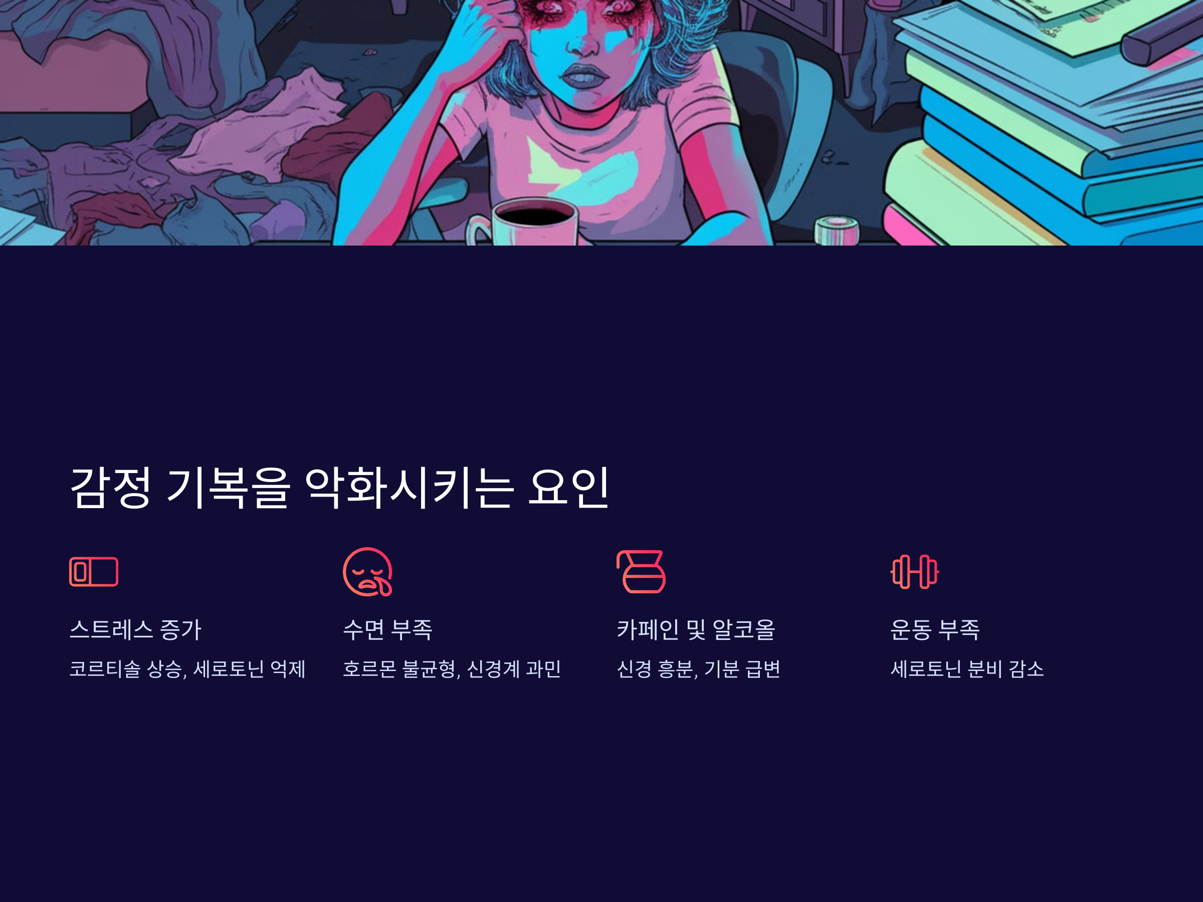 - 스트레스 증가: 지속적인 스트레스는 코르티솔 수치를 높이고, 세로토닌 분비를 억제해 감정 기복을 더욱 심하게 만든다.