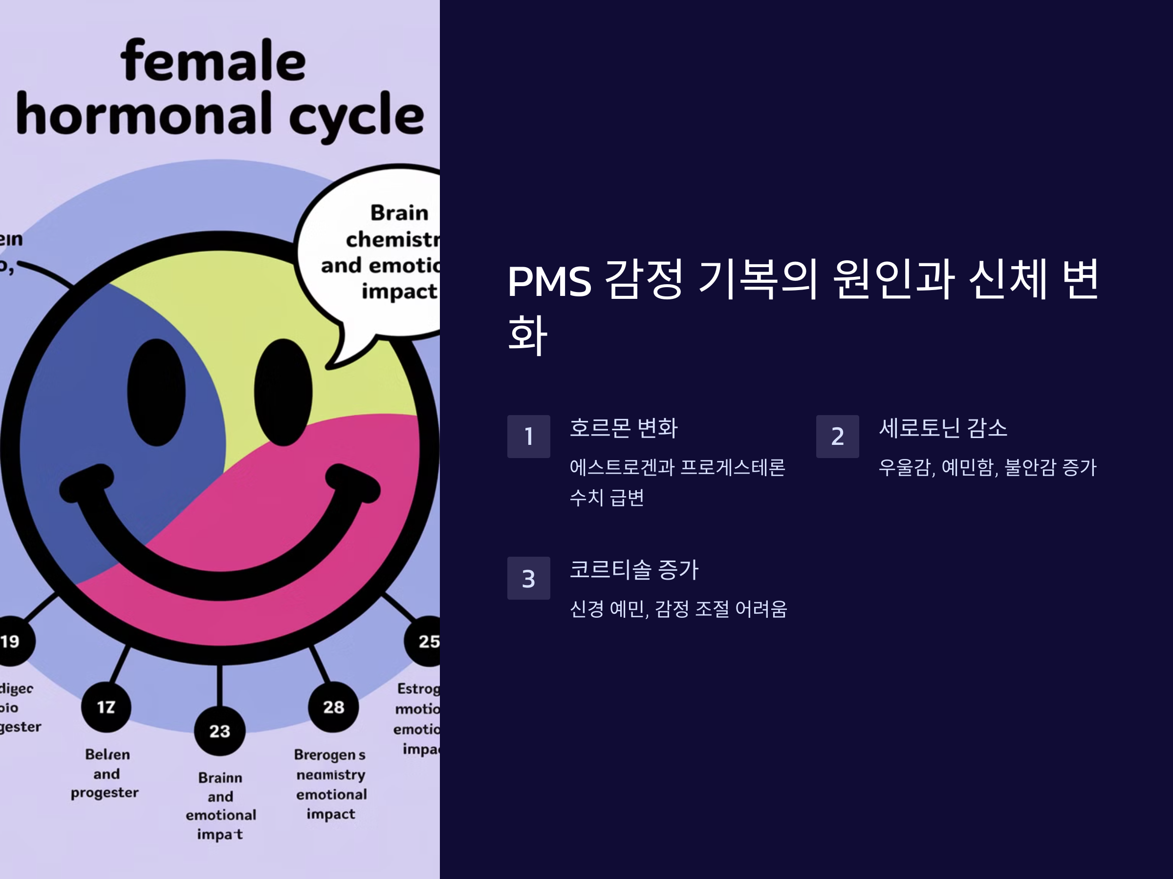PMS로 인한 감정 기복은 주로 호르몬 변화에서 비롯된다. 생리 주기 동안 여성 호르몬인 에스트로겐과 프로게스테론 수치가 급격하게 변하면서 신경전달물질에도 영향을 주어 감정 변화가 발생한다. 특히, 세로토닌 수치가 감소하면 우울감, 예민함, 불안감이 증가할 수 있다.
