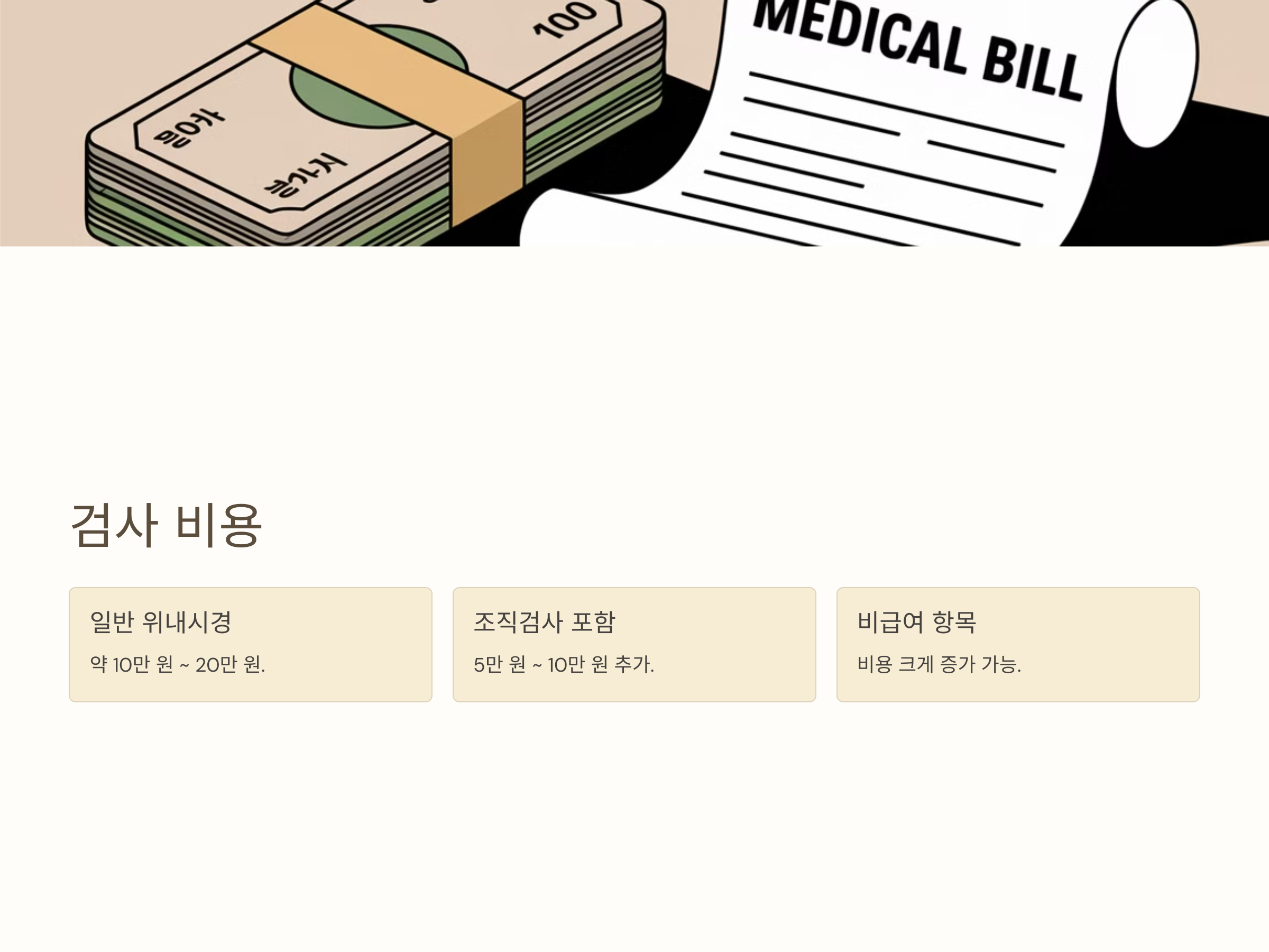 - 비급여 항목: 위내시경 검사 외에도 용종 제거나 내시경 초음파 등의 비급여 항목이 추가될 수 있습니다. 이러한 경우 비용이 크게 증가할 수 있습니다.