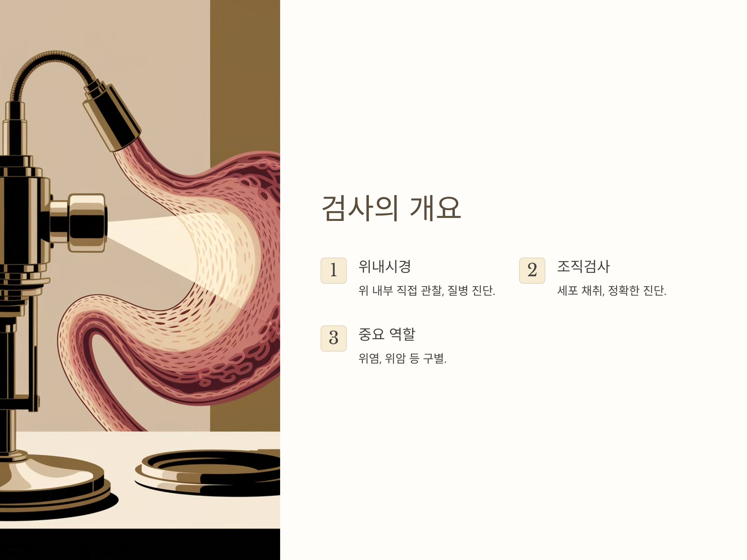 위내시경은 위의 내부를 직접 관찰하여 다양한 질병을 진단하는 검사입니다. 위궤양, 위염, 용종, 암 등 여러 질환을 진단할 수 있습니다. 위내시경을 통해 위점막을 검사하고, 필요시 조직검사를 통해 세포를 채취하여 보다 정확한 진단을 내릴 수 있습니다. 이때 조직검사는 비슷한 증상을 유발할 수 있는 위염, 위암 등을 구별하는 데 중요한 역할을 합니다.