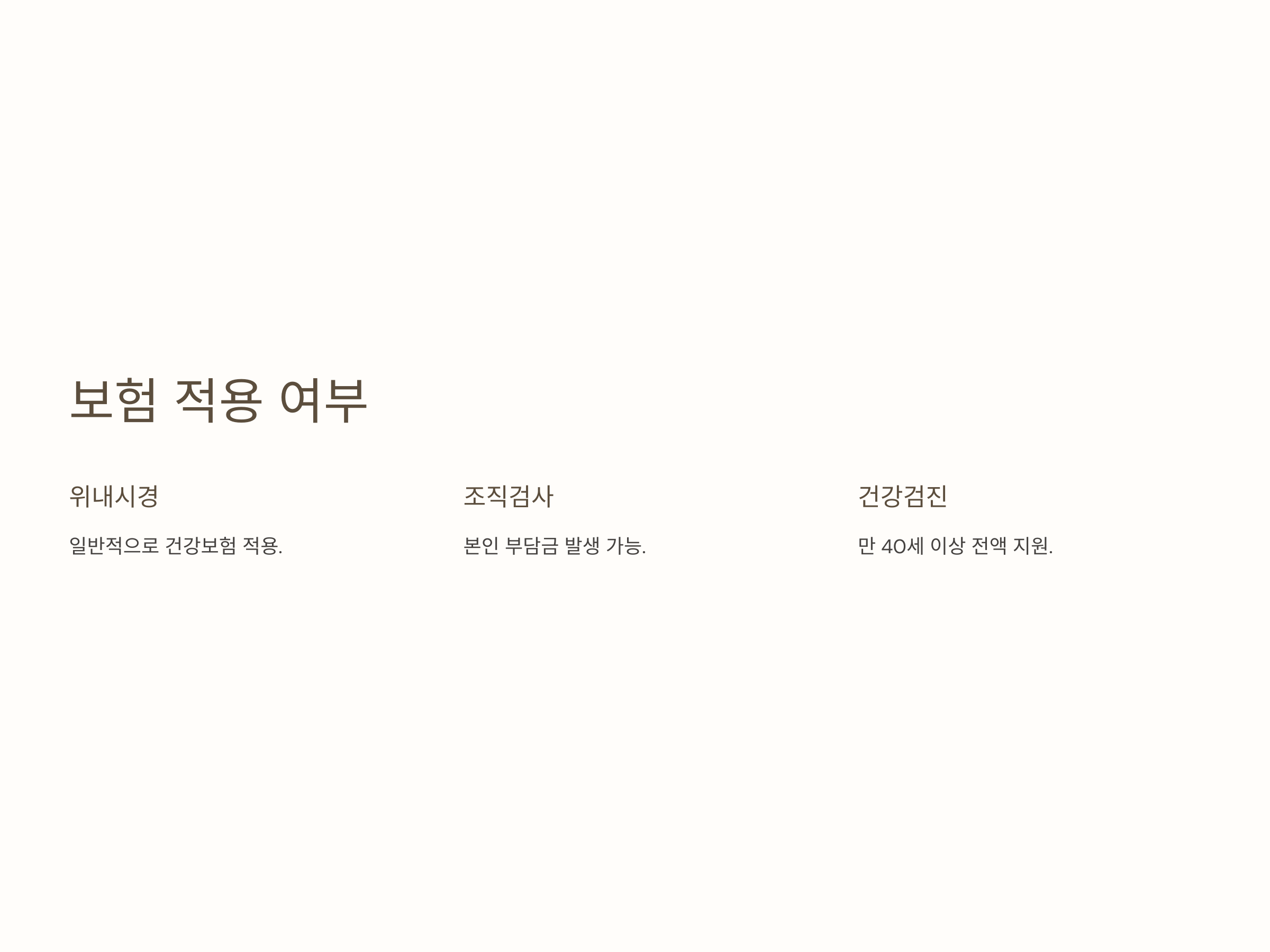- 건강검진을 통한 검사: 만 40세 이상 성인은 2년마다 국가 건강검진에서 위내시경 검사를 받을 수 있습니다. 이 경우에는 건강보험이 전액 지원됩니다.