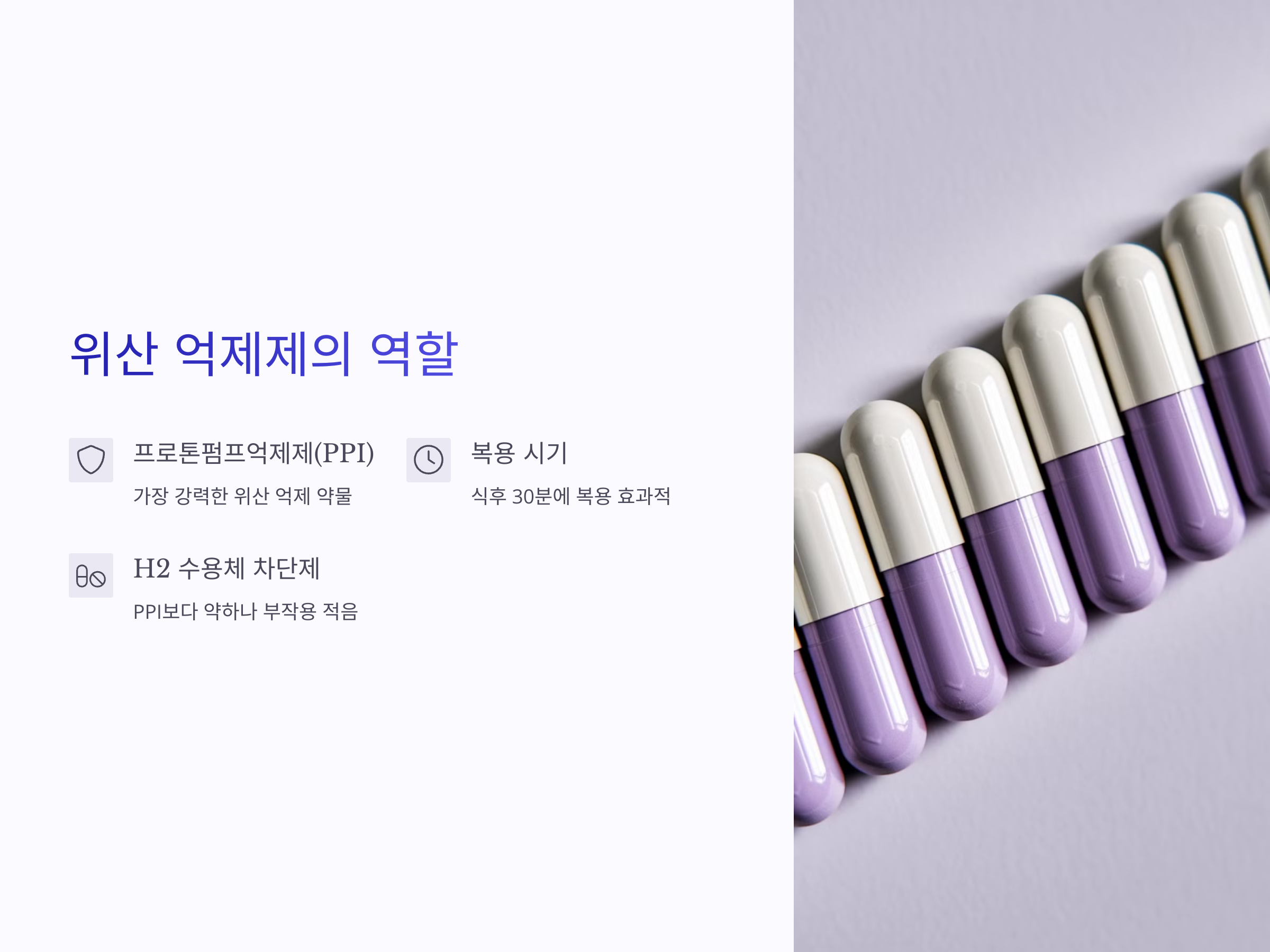 H2 수용체 차단제는 위산 분비를 억제하는 약물로, PPI보다 상대적으로 약한 효과를 보입니다. 그러나 위산 억제 효과는 충분하며, 부작용이 적어 일부 환자에게는 적합할 수 있습니다.